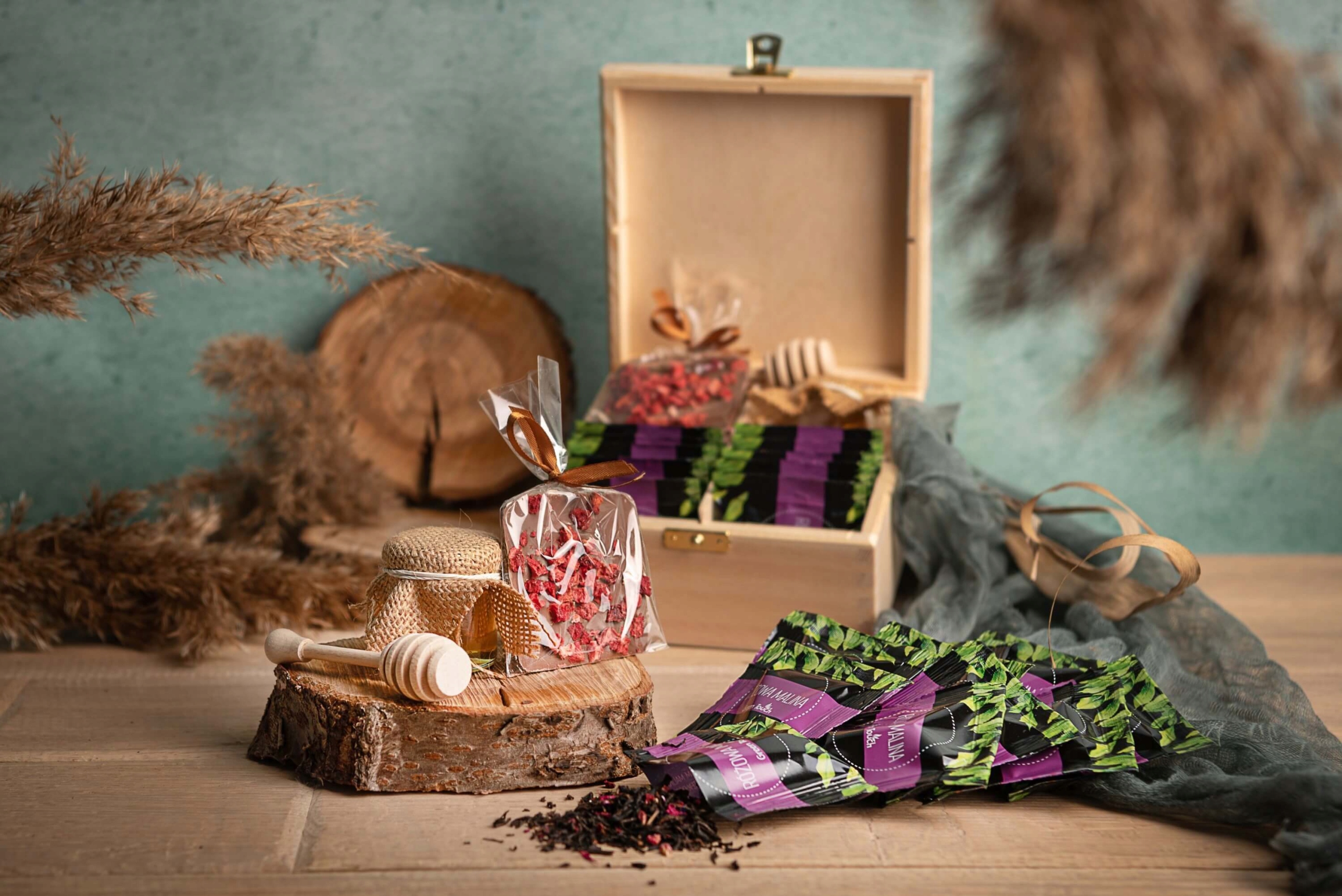 Шкатулка изготовлена из массива дерева и содержит набор из 10 чаев, неаполитанского шоколада и натурального меда с ложечкой.