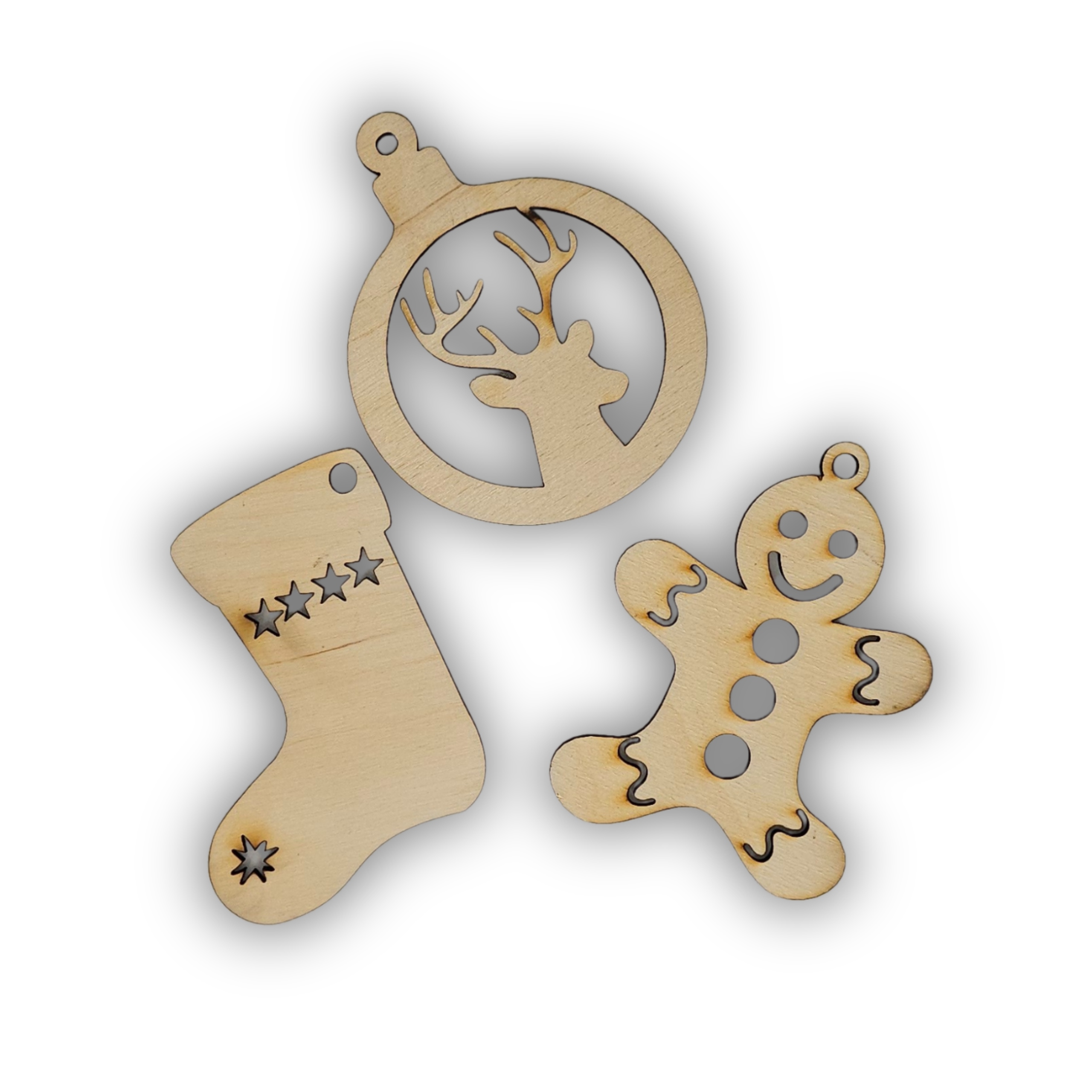 - 3 деревянных украшения (пряник, олень, носок) - послужат очаровательными елочными безделушками.