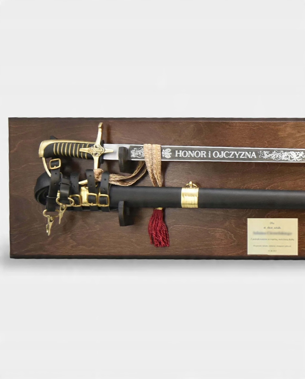 <р> * Сабля ВМФ Войска Польского wz76 с ножнами и гравировкой Честь и Родина <р> * двойная доска для сабли с темно-коричневыми ножнами <р> * гравированная табличка с посвящением столуБЕСПЛАТНАЯ ГРАВИРОВКА ПОСВЯЩЕНИЕ! Текст для гравировки просьба указывать в «сообщении продавцу» при оформлении заказа.