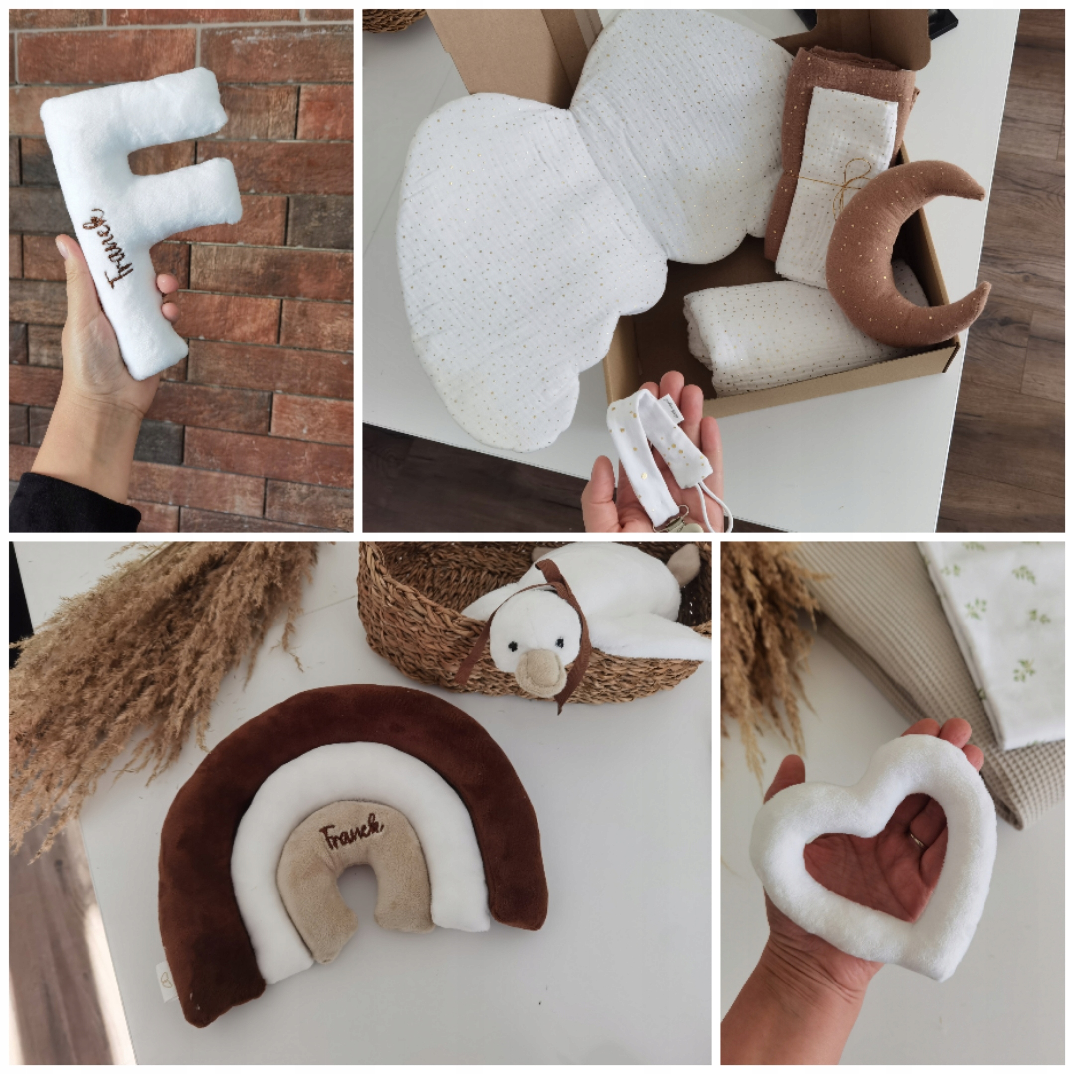 На всех одноцветных элементах можно вышить короткую надпись, напр. имя или инициалы ребенка выбранным шрифтом и цветом. Перед вышивкой мы отправляем надпись различными шрифтами на выбор и определяем цвет шрифта.