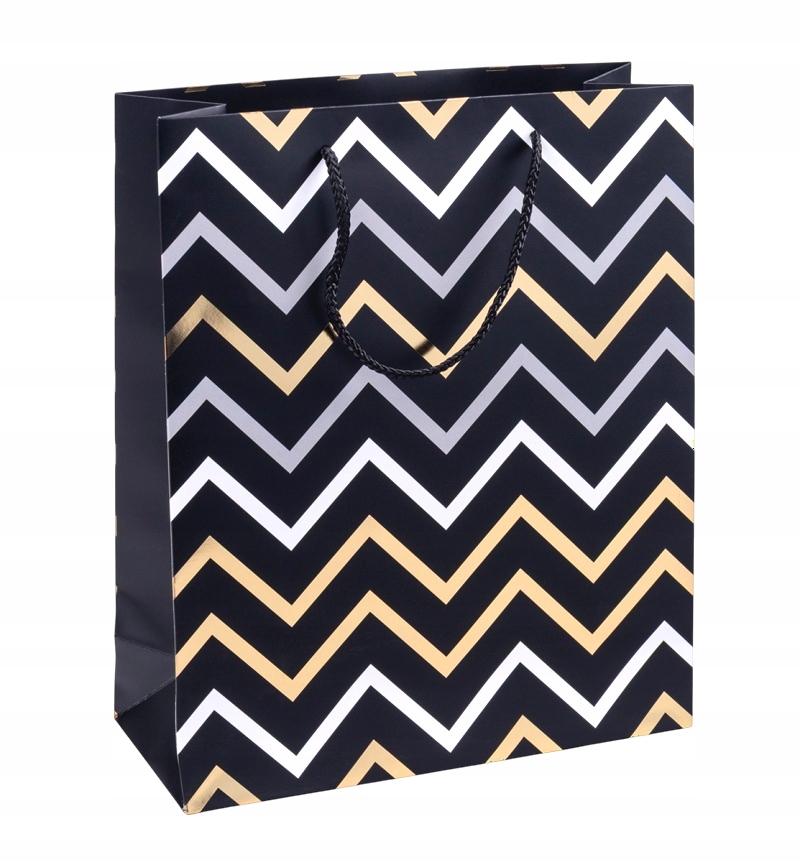 Стильный подарочный пакет с неподвластным времени зигзагообразным узором сочетает черный с золотыми и серебряными акцентами, создавая привлекательный и в то же время универсальный дизайн.