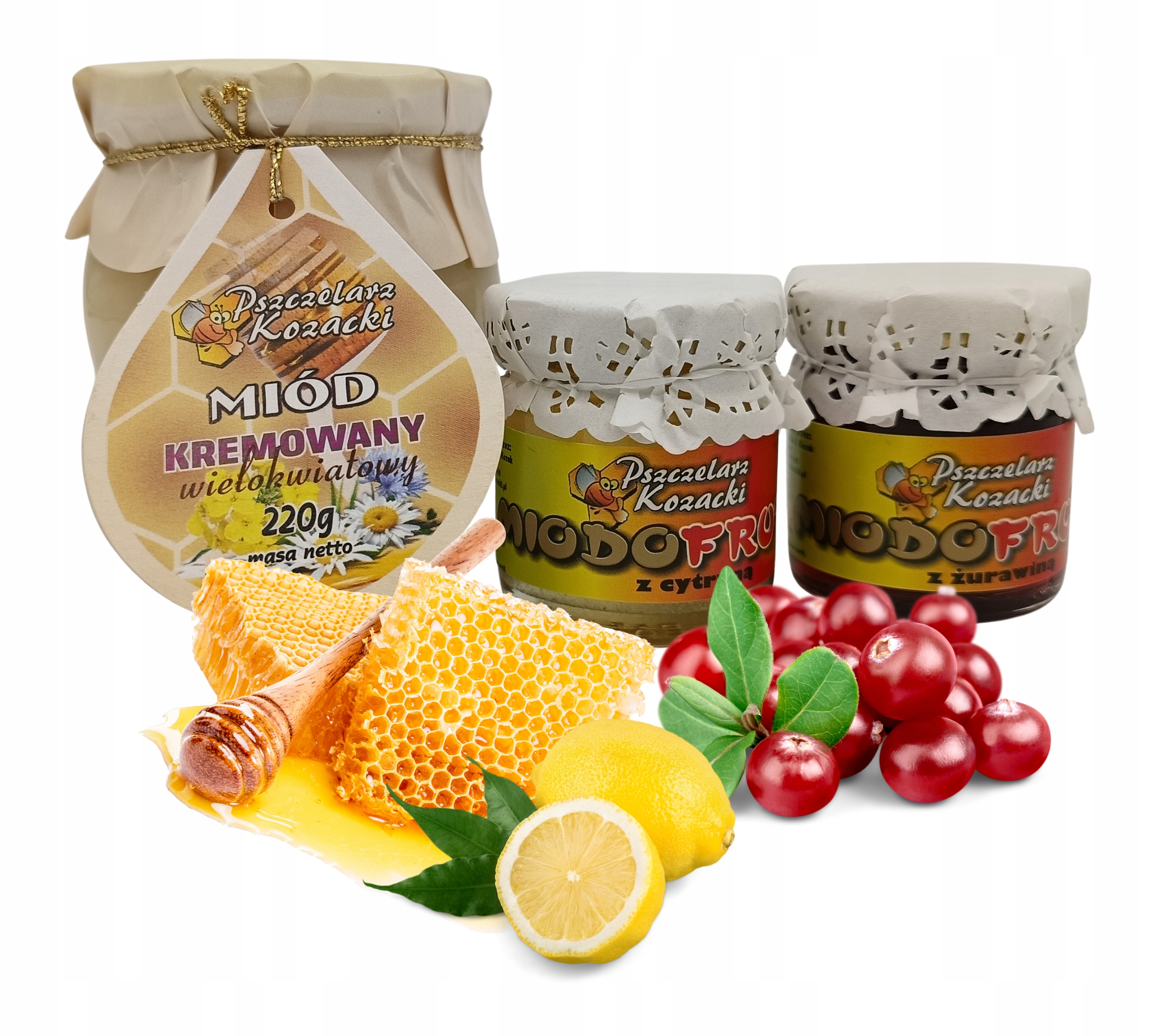 ✔️ 2 x Мед с фруктовым соком 50 г - мед с фруктовым соком доступен в трех вкусах, с добавлением клюквы, лимона, малины, двух случайным образом