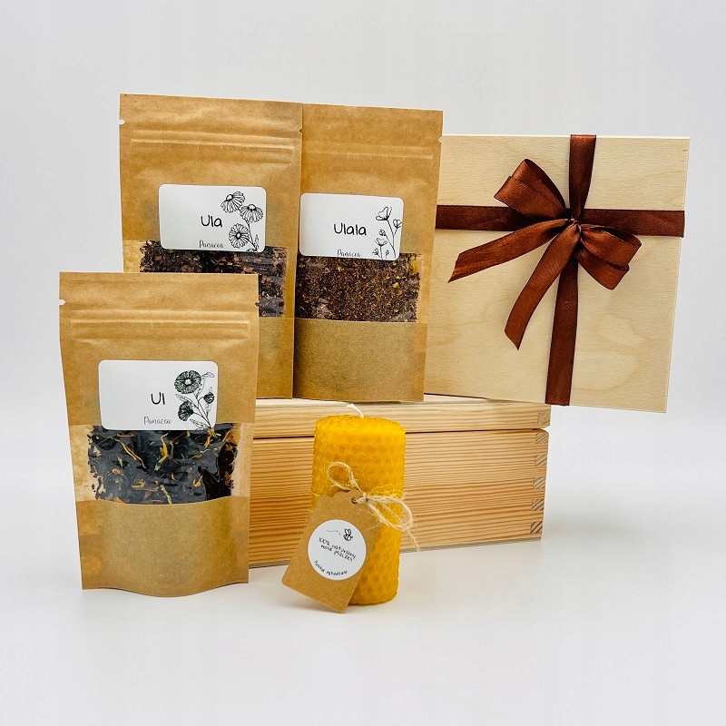 Красивый и практичный подарок для близких. Набор вкусных чаев и свеча из пчелиного шланка. Целое упаковано в деревянную коробку. Флористические дополнения дополняют этот оригинальный подарок, давая волшебное обаяние