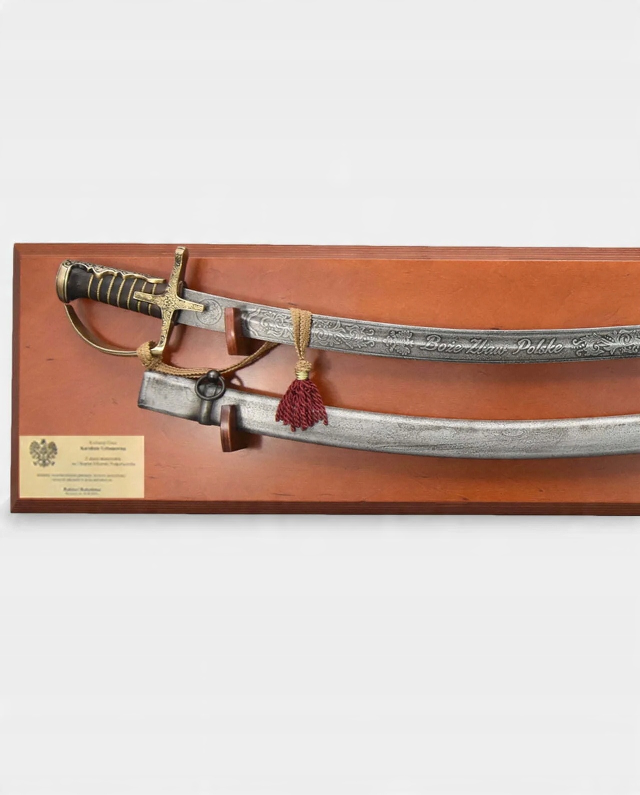 <р> * старинная патинированная гусарская сабля с ножнами и гравировкой: «Боже, храни Польшу!» <р> * двойная доска для сабли с ножнами (цвет в зависимости от наличия: темно-коричневый или красное дерево) <р> * гравированная табличка с посвящением столуБЕСПЛАТНАЯ ГРАВИРОВКА ПОСВЯЩЕНИЕ! Текст для гравировки просьба указывать в «сообщении продавцу» при оформлении заказа.