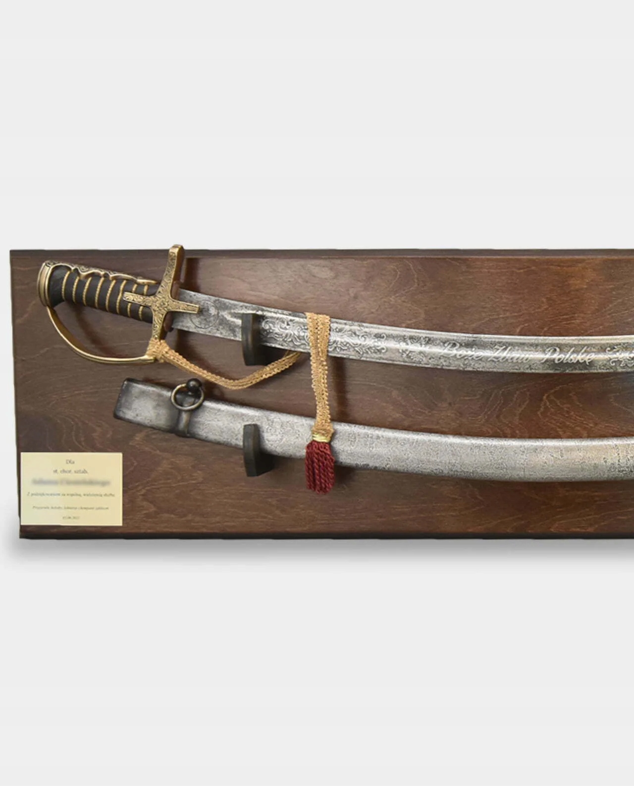 <р> * старинная патинированная гусарская сабля с ножнами и гравировкой: «Боже, храни Польшу!» <р> * двойная доска для сабли с темно-коричневыми ножнами <р> * гравированная табличка с посвящением столуБЕСПЛАТНАЯ ГРАВИРОВКА ПОСВЯЩЕНИЕ! Текст для гравировки просьба указывать в «сообщении продавцу» при оформлении заказа.