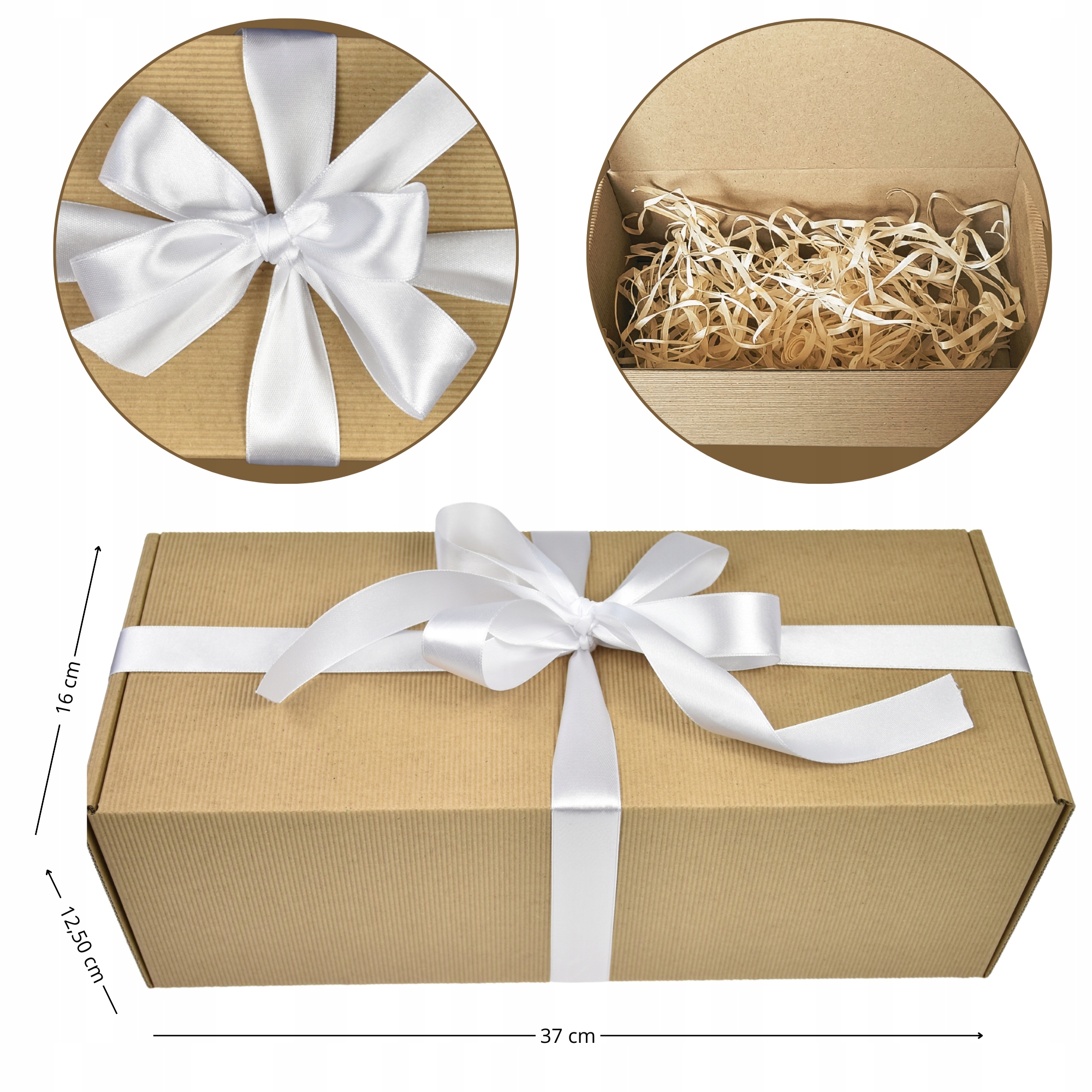 - коробка Подарки с коричневым гофрированным картон, заполненным деревянной шерстью, 37 см х 16 см х 12,5 см