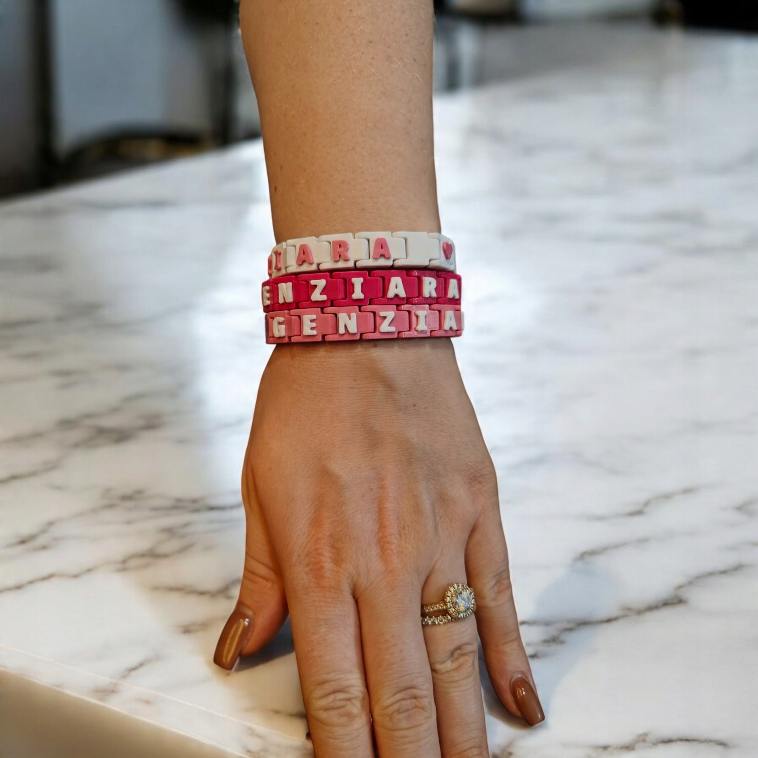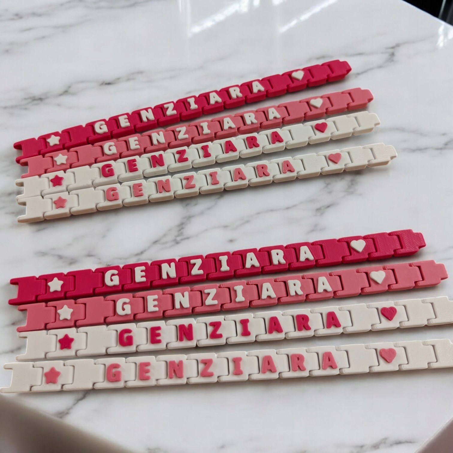 персонализированный цвет и сопоставление браслет Gen Gench доступен в нескольких оттенках розового и белого, что дает ему уникальный характер. Цвета вдохновлены тенденциями молодежной моды, а также стилизацией создателей из канала GE NZA, благодаря которого это идеальное дополнение как для более молодых, так и для пожилых фанатов.