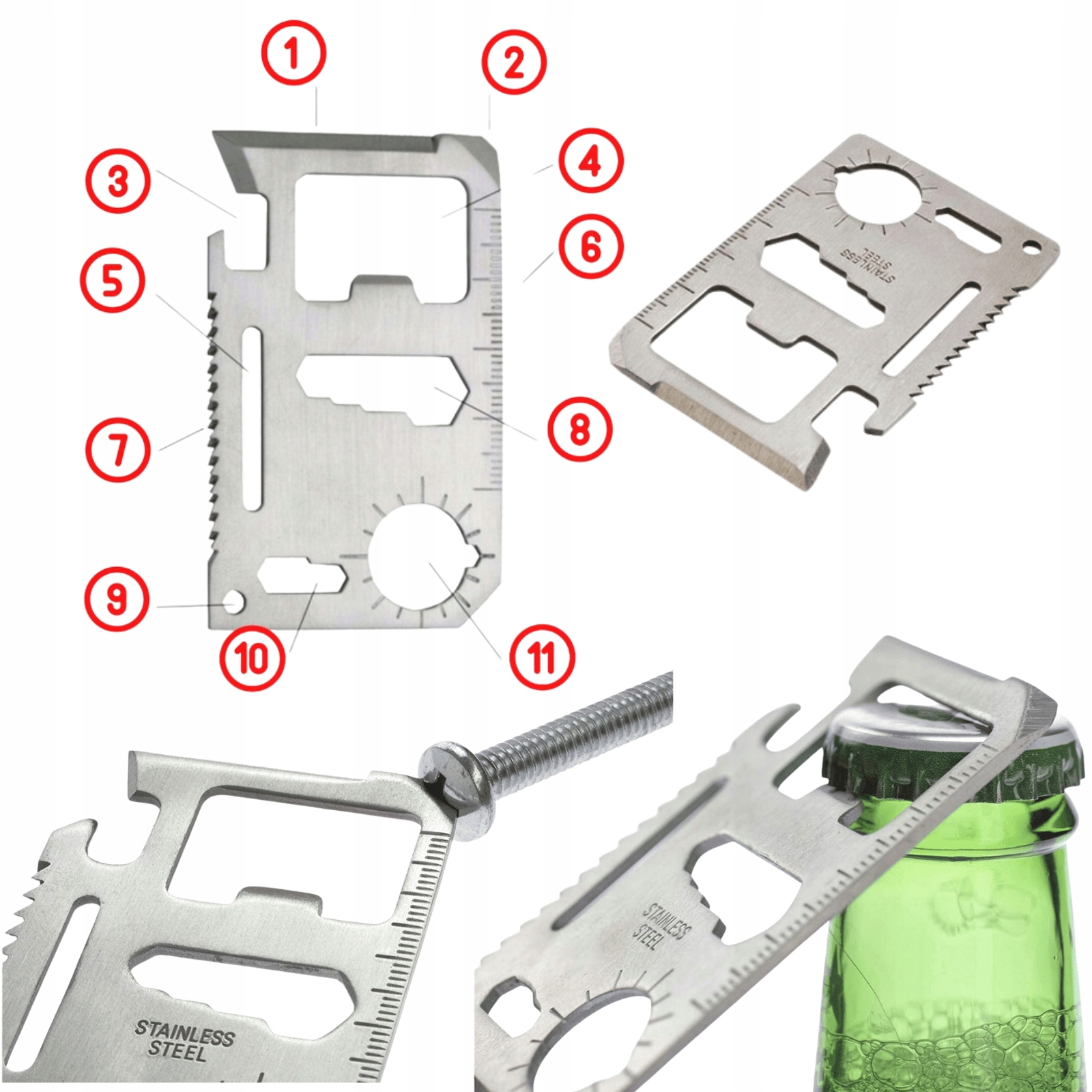 Многофункциональная карточка инструментов из прочной нержавеющей стали. Помещается в вашем кошельке или кармане — идеально подходит для кемпинга, экспедиций или повседневных чрезвычайных ситуаций. В комплект входит черный защитный чехол.