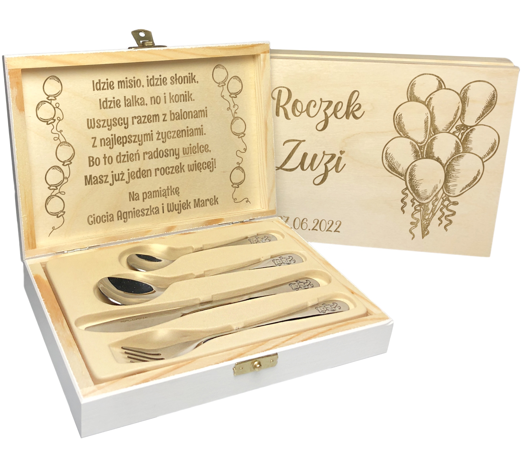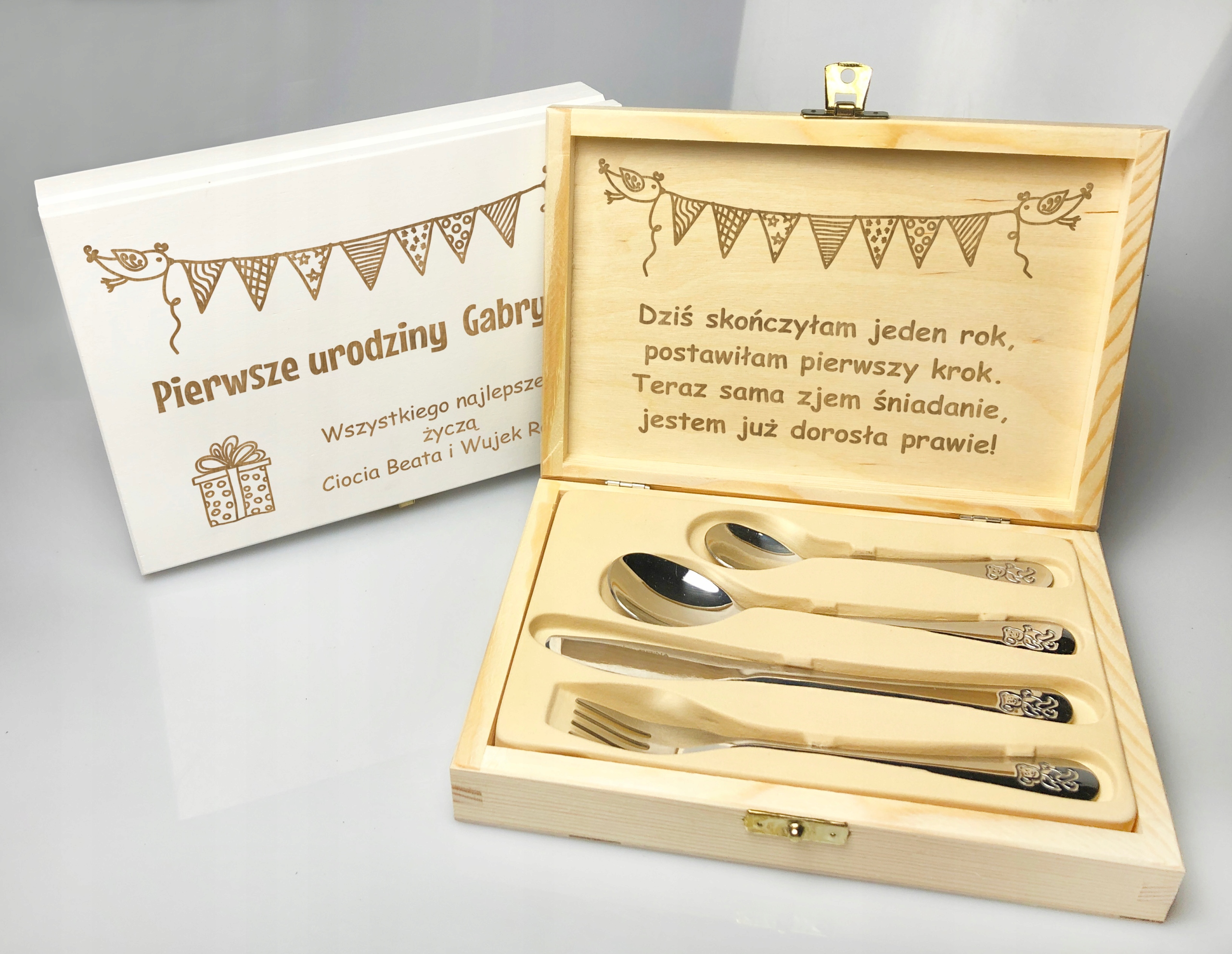 ПОДАРУНОК ДИТИНІ НА ДЕНЬ НАРОДЖЕННЯ СТОЛОВІ ПРИБОРИ В ДЕРЕВ'ЯНІЙ КОРОБЦІ З ГРАВІЮВАННЯМ