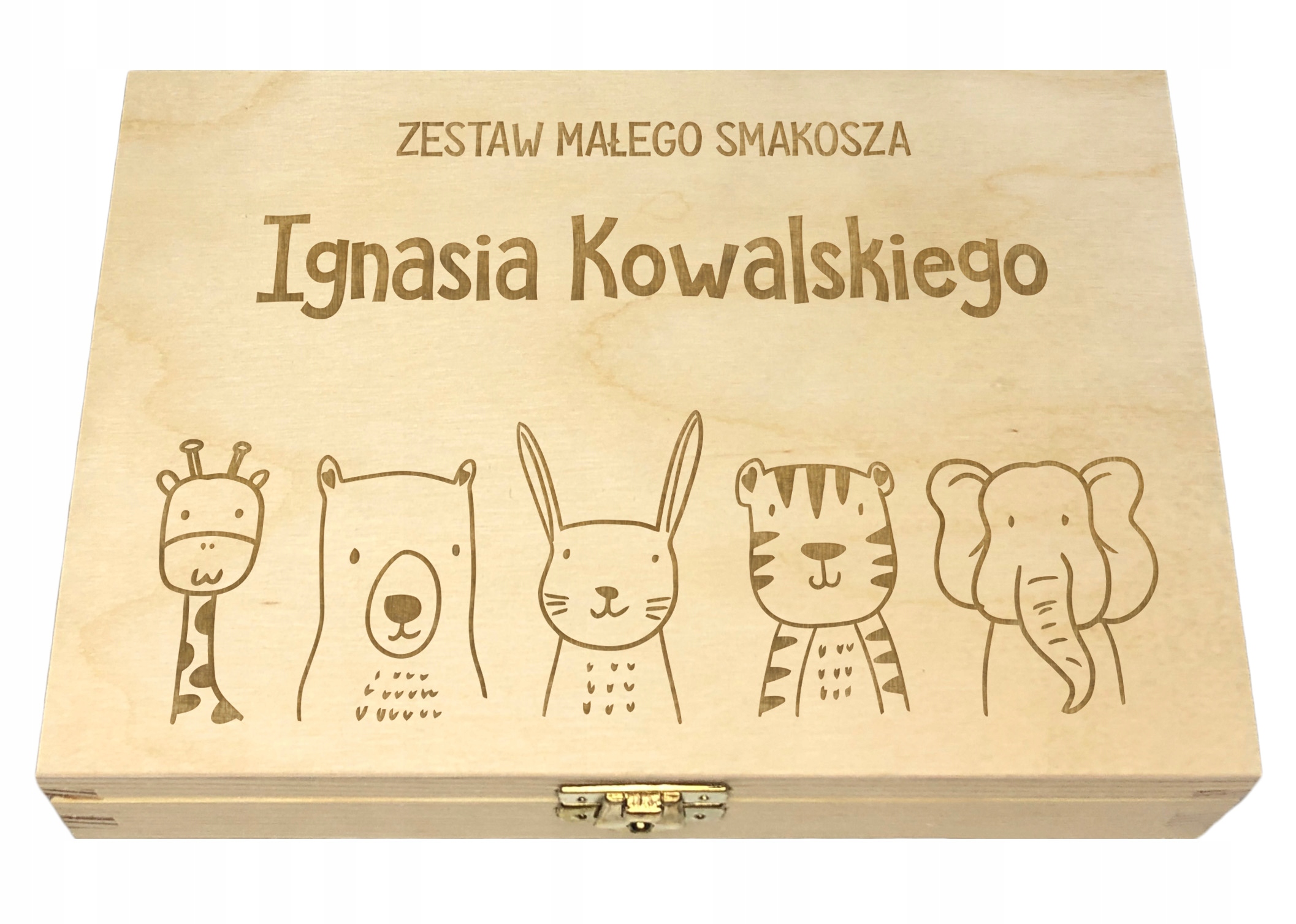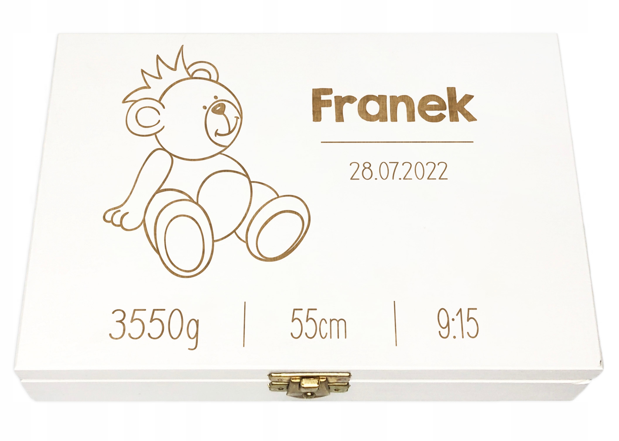 Деревянная шкатулка с гравировкой отлично подойдет в качестве подарка ребенку на первый день рождения. В набор входят столовые приборыиз нержавеющей стали с рельефным мотивом плюшевого мишки, что помогает ребенку научиться пользоваться всеми элементами набора. p>