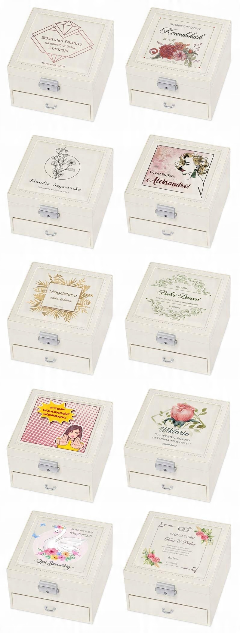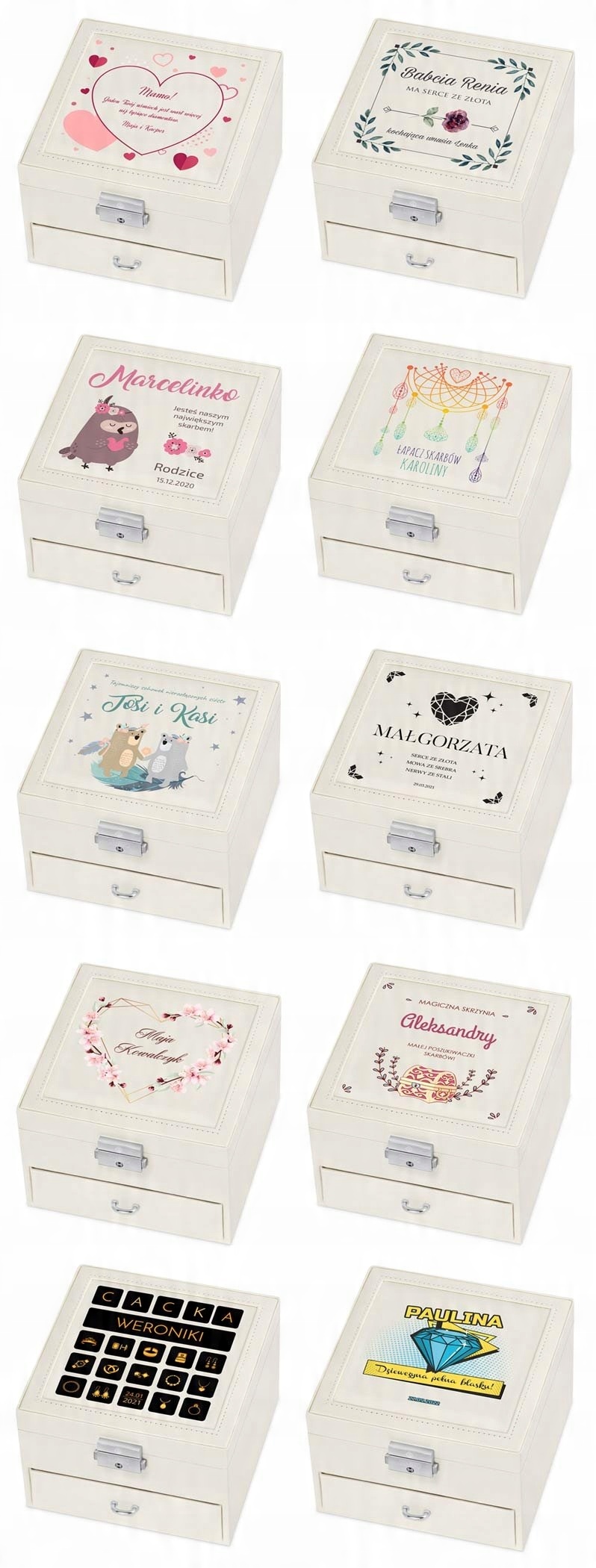 Вам интересно, что лучше всего подойдет в качестве оригинального подарка для особенной женщины? Наша шкатулка для драгоценностей идеально подойдет на эту роль. Он характеризуется классической формой и точными деталями. Приятные пастельные тона футляра и тонкая строчка подчеркивают эксклюзивность изделия. В верхней части находится большое подвижное зеркало и место для ожерелий, браслетов и десяти колец. В нижней части коробки имеется ящик с девятью отдельными местами, например, для сережек, подвесок и других аксессуаров. Пространство внутри чехла покрыто приятным на ощупь бархатным материалом.