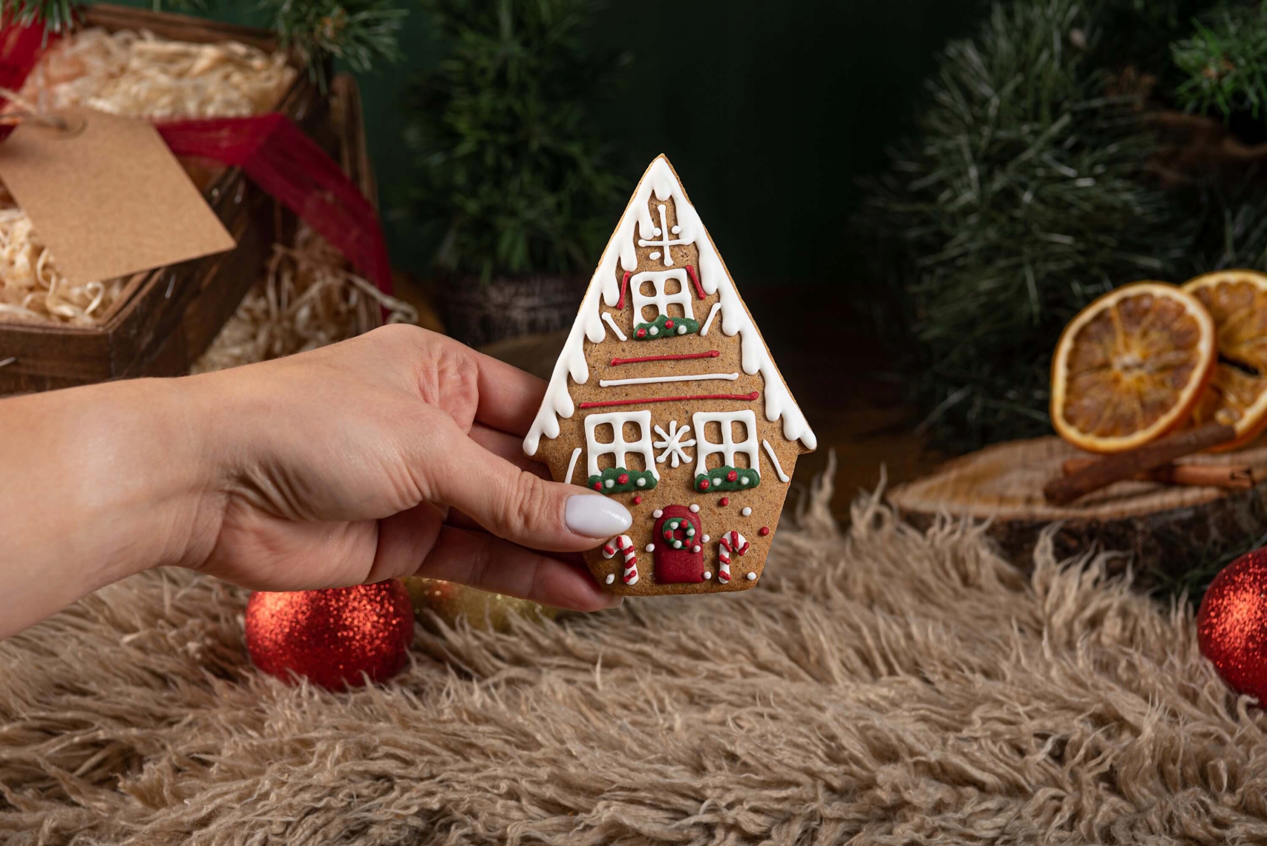 - Натуральный большой пряник в форме рождественского домика. Вкусный торт, изготовленный и украшенный вручную фабрикой. Цветной с фруктами и овощами.