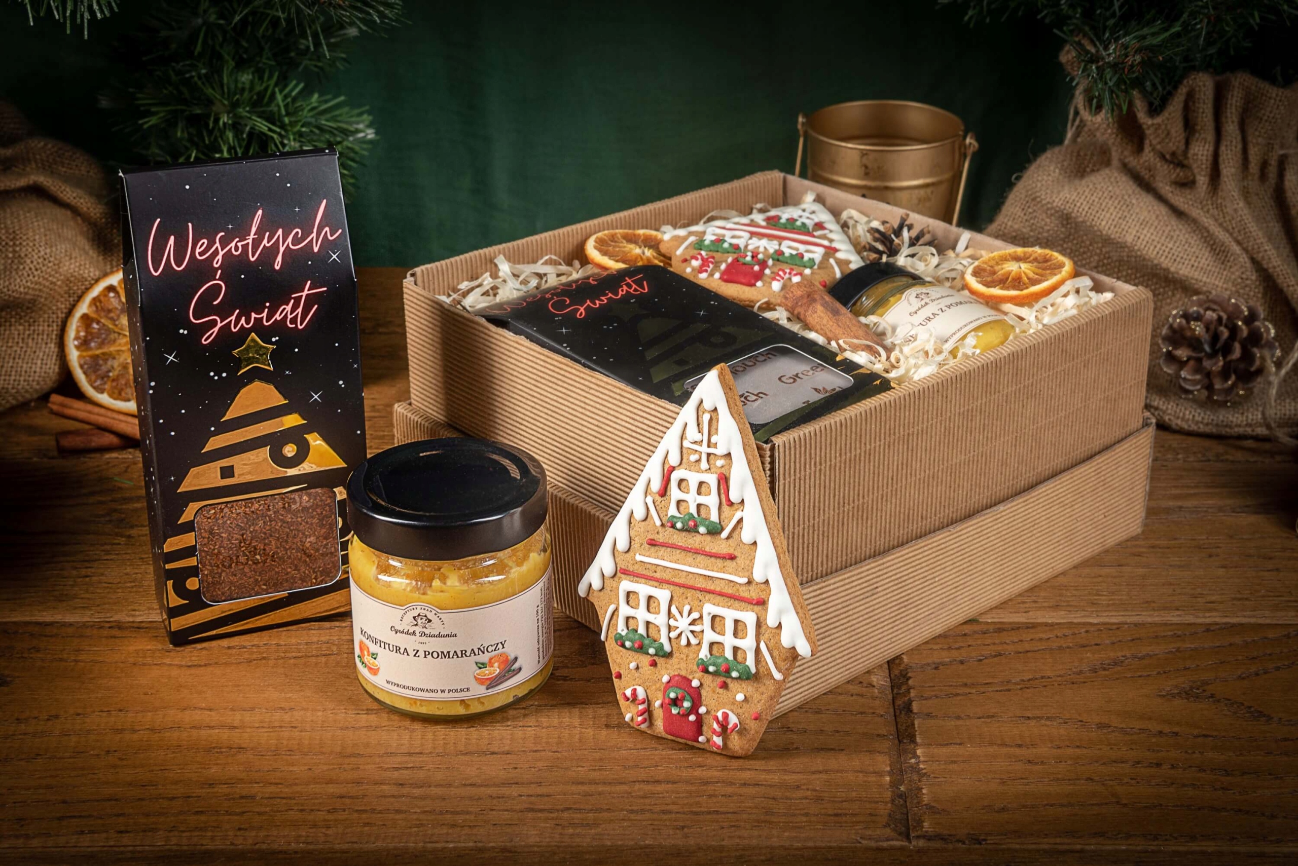 Рождественская подарочная коробка с чаем, вареньем и пряниками