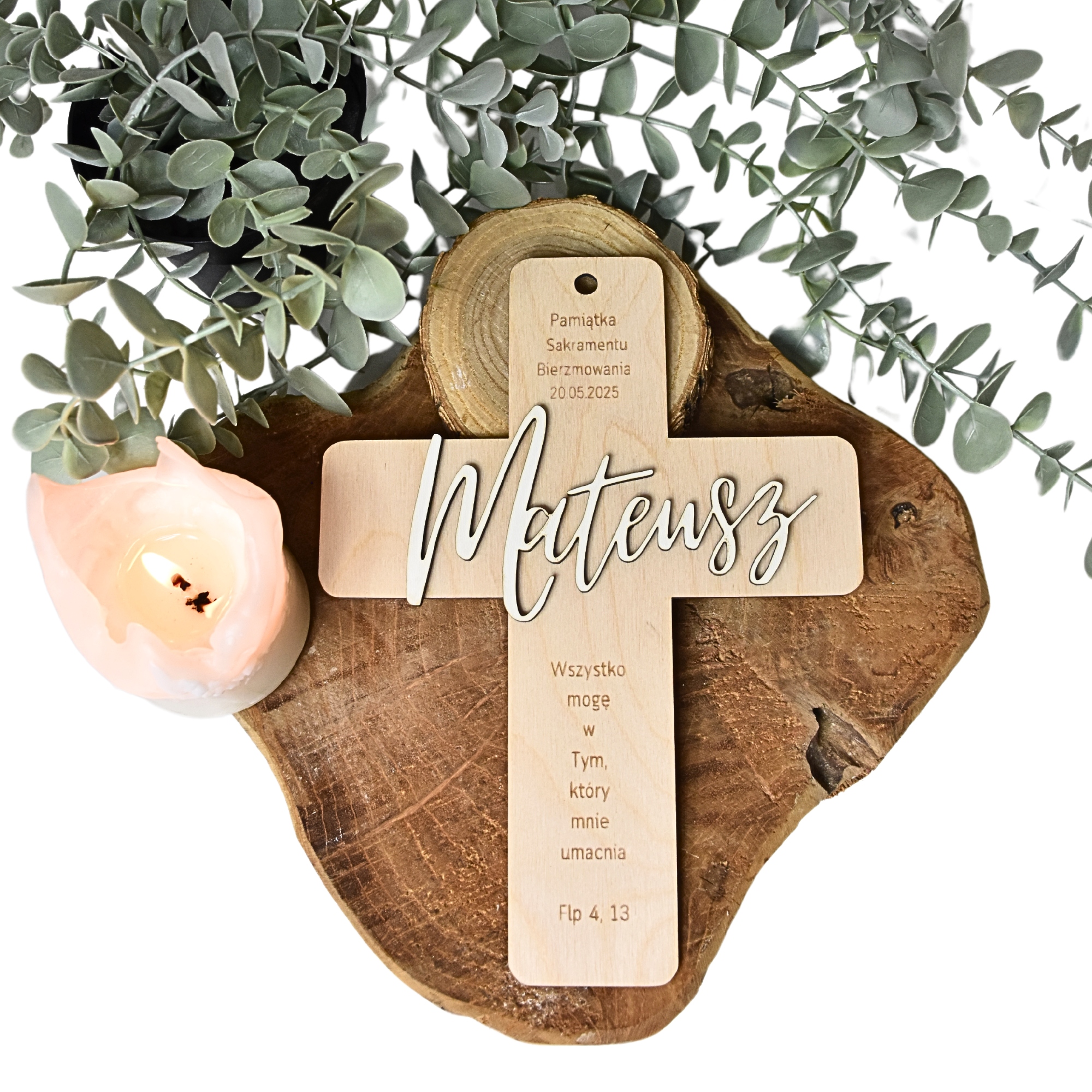 Персонализированная гравюра на деревянной фанере в форме креста.