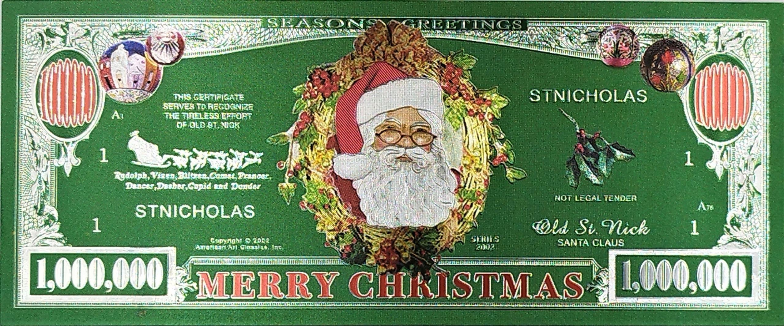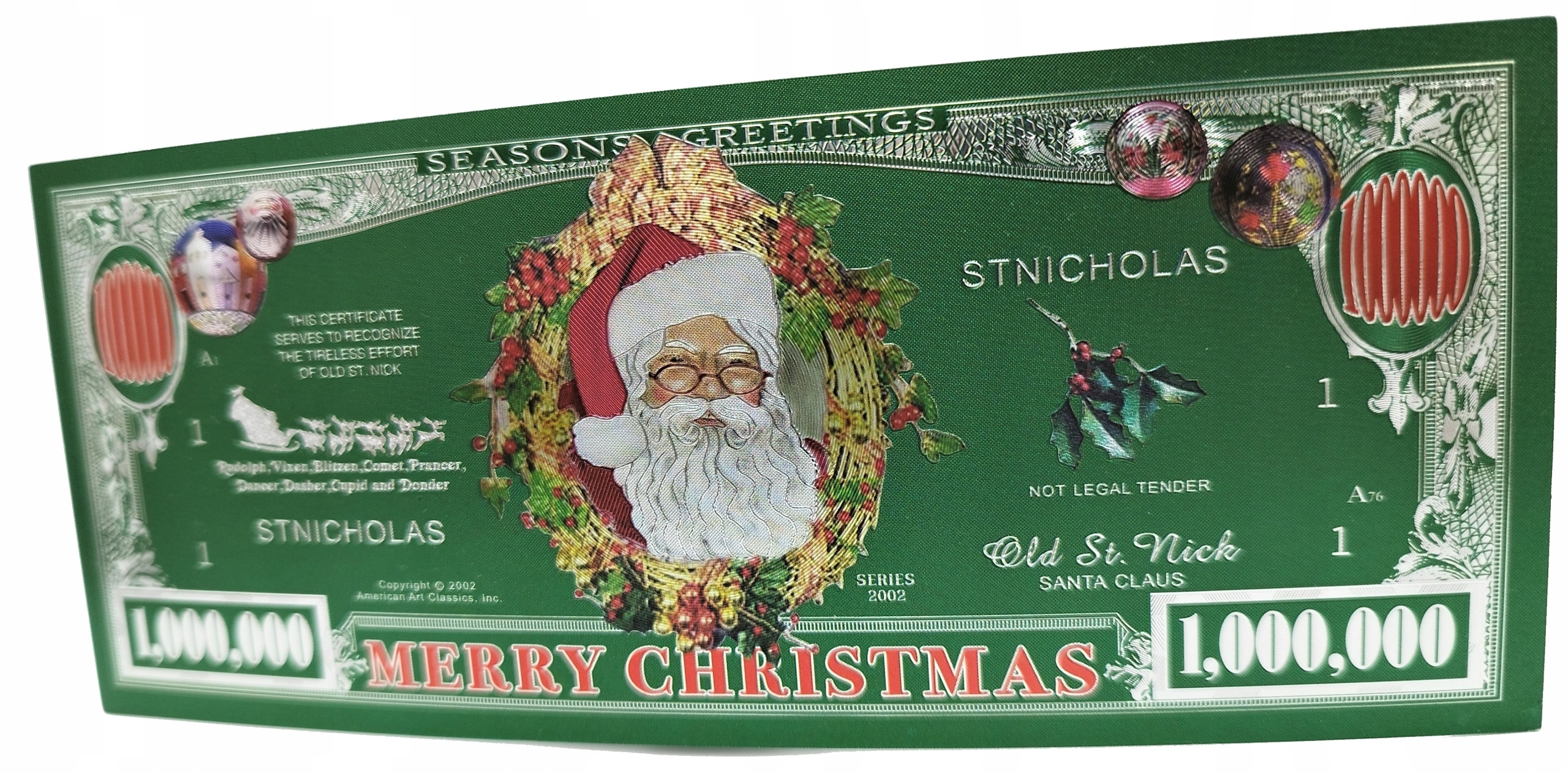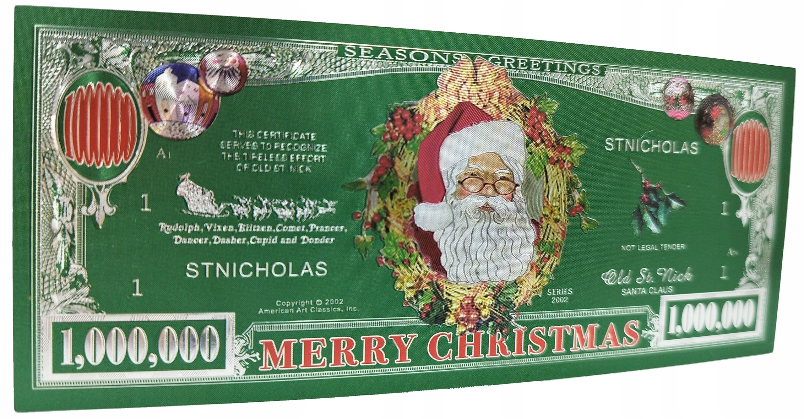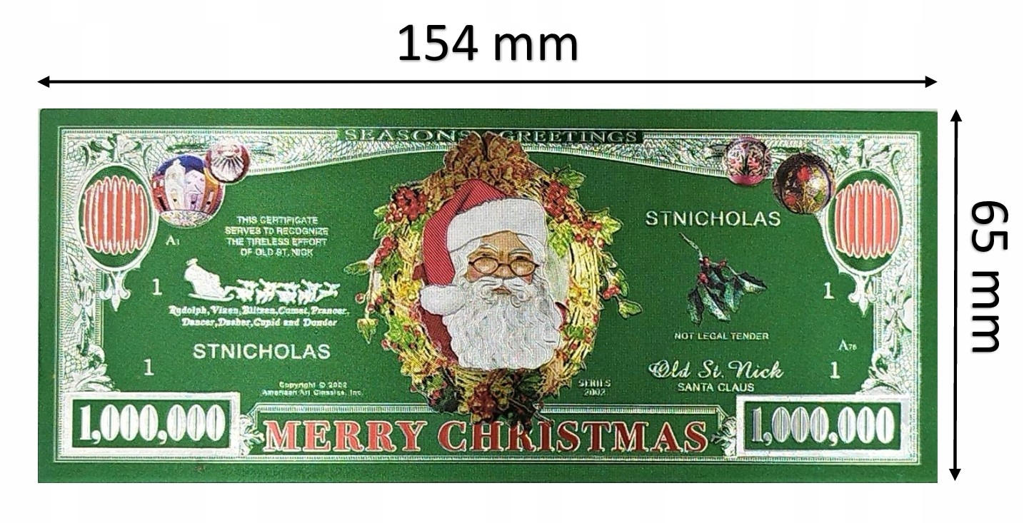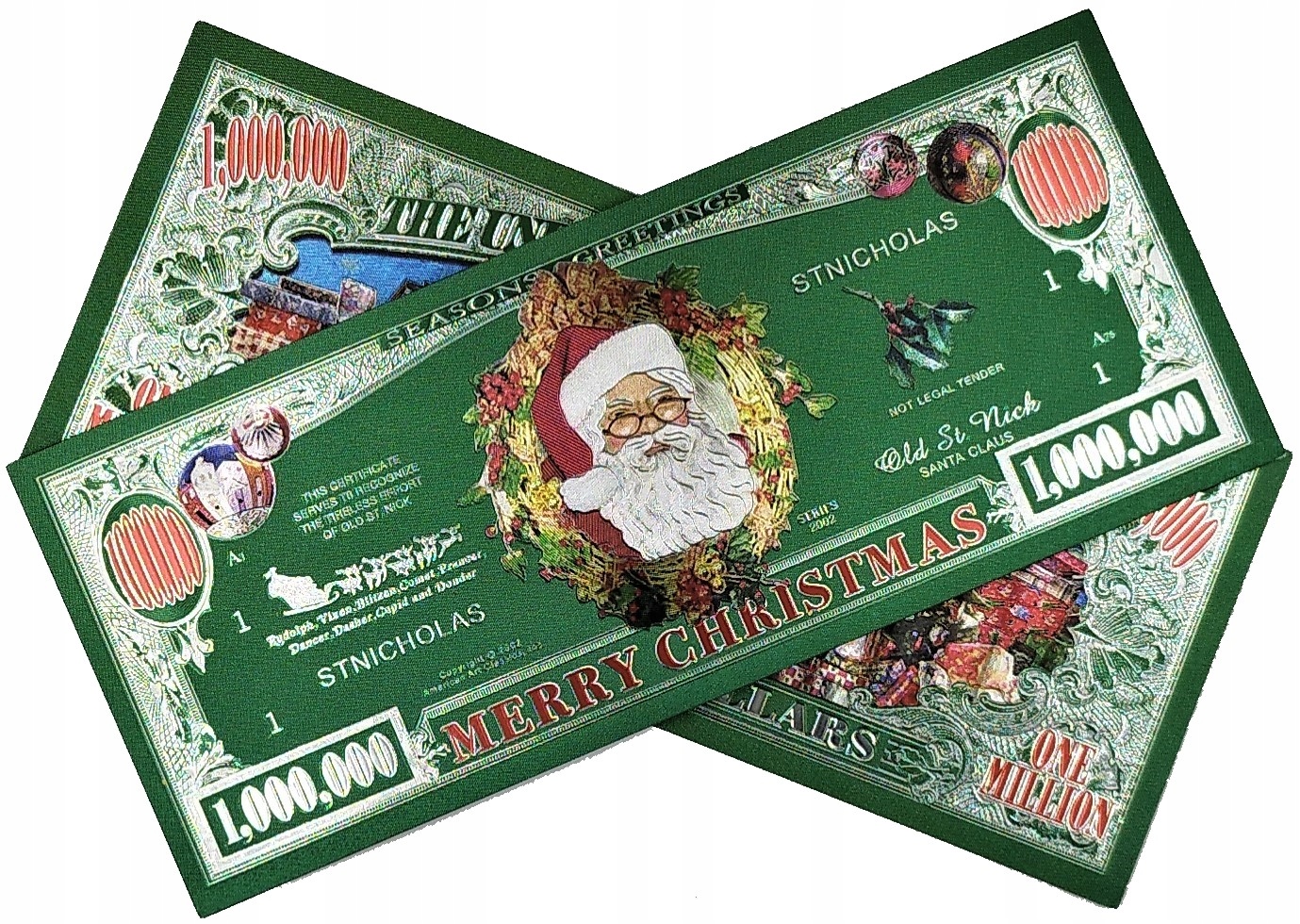 Необычная рождественская банкнота с изображением Деда Мороза. Это интересное предложение для любителей различного рода гаджетов и уникальных подарков. Рождественская тема делает его идеальной идеей рождественского подарка. Форма банкноты взята у американского доллара, однако номинал носит лишь символический характер.