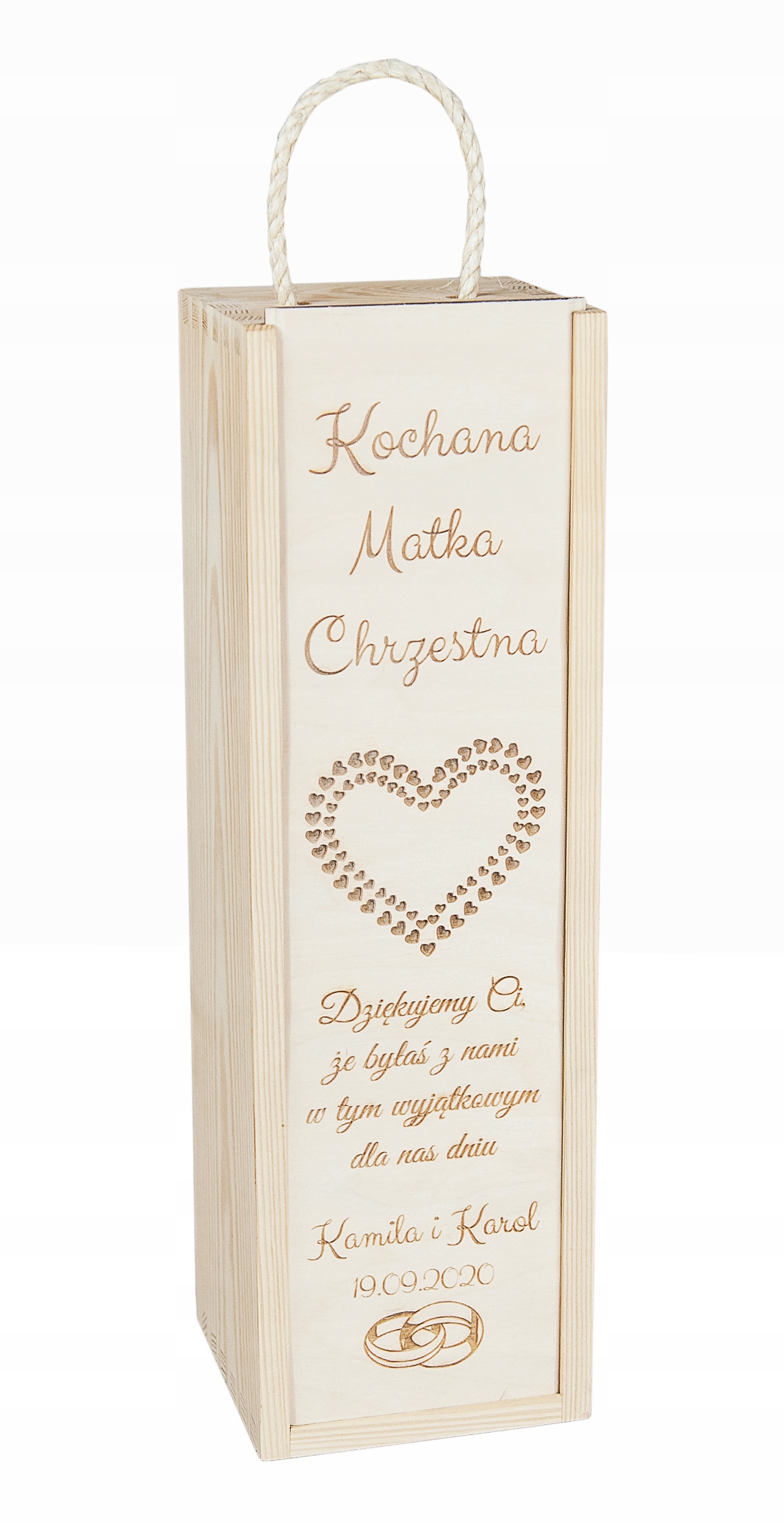 Ящик для алкоголя, в который можно поместить вино, станет элегантным сувениром для ваших крестных по случаю свадьбы. Изделие изготовлено точно и добротно из деревянной фанеры и гравировано по вашей инструкции.