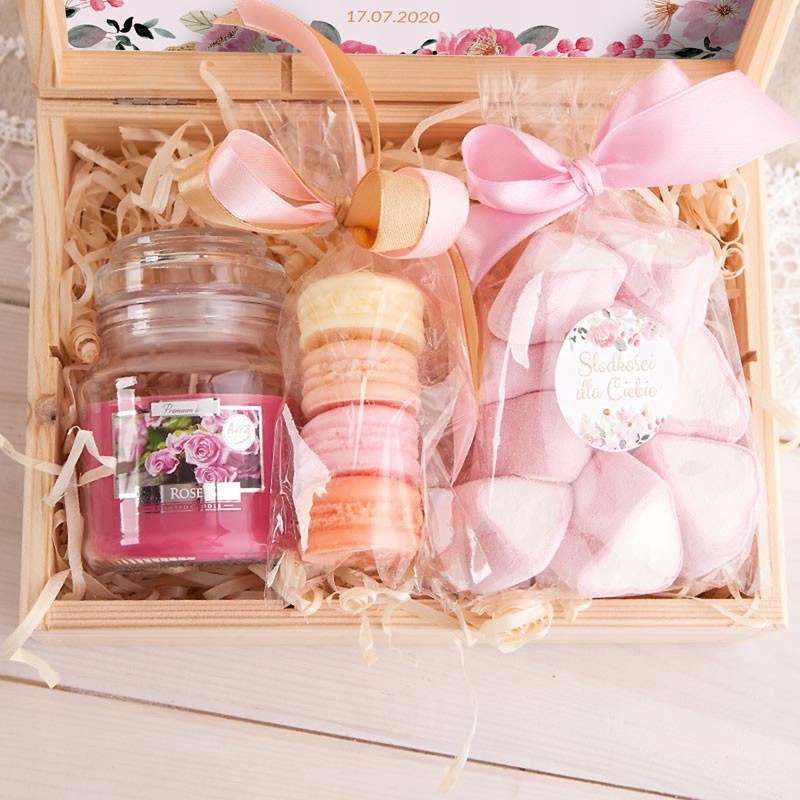 - состав: большая коробка из натурального дерева, наполненная натуральной древесной шерстью и ингредиентами высочайшего качества, в комплект входят: мыло-макаруны (4 штуки по 20 г) с прекрасным ароматом и пастельными тонами - мыло изготовлено вручную в Польша , большая ароматическая свеча в баночке красивого розового цвета и ароматный зефир, коробка дополнительно украшена открыткой с графикой и красивым текстом благодарности и персонализацией.