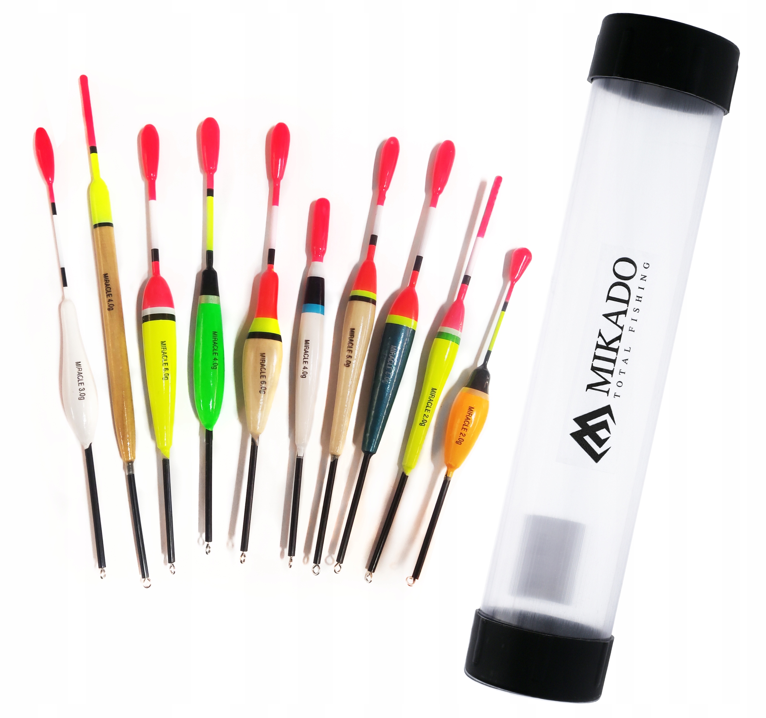 Набор универсальных проходных поплавков различных размеров. Красивая выразительная картина с привлекательными усиками. Разнообразные грузила в удобной и прочной тубусе для поплавков MIKADO.