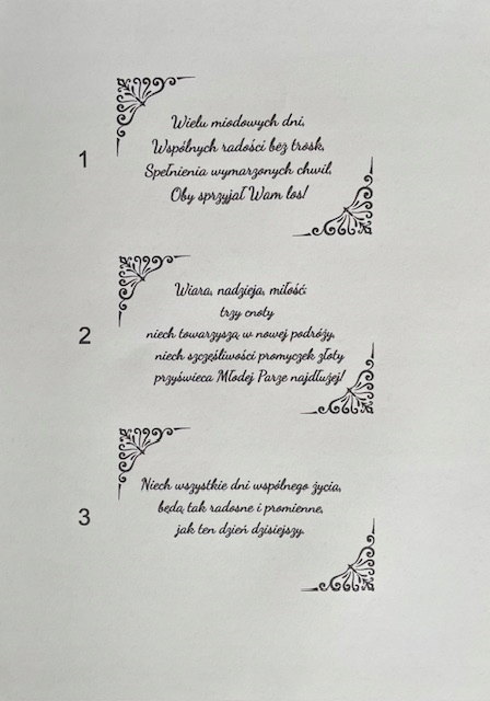 3. Имена невесты и невесты и даты свадьбы, например, Agnieszka & Andrzej 17.06.2023 - Если это требует этого !!!.