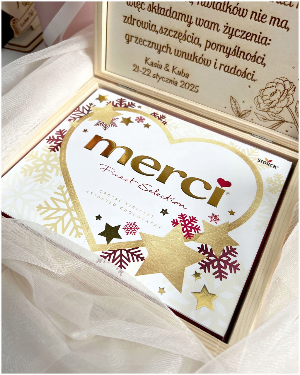Именантная деревянная шкатулка с выгравированными пожеланиями – отличная идея выразить благодарность любимым бабушкам и дедушкам. Коробка идеально подходит для шоколадных конфет Merci.