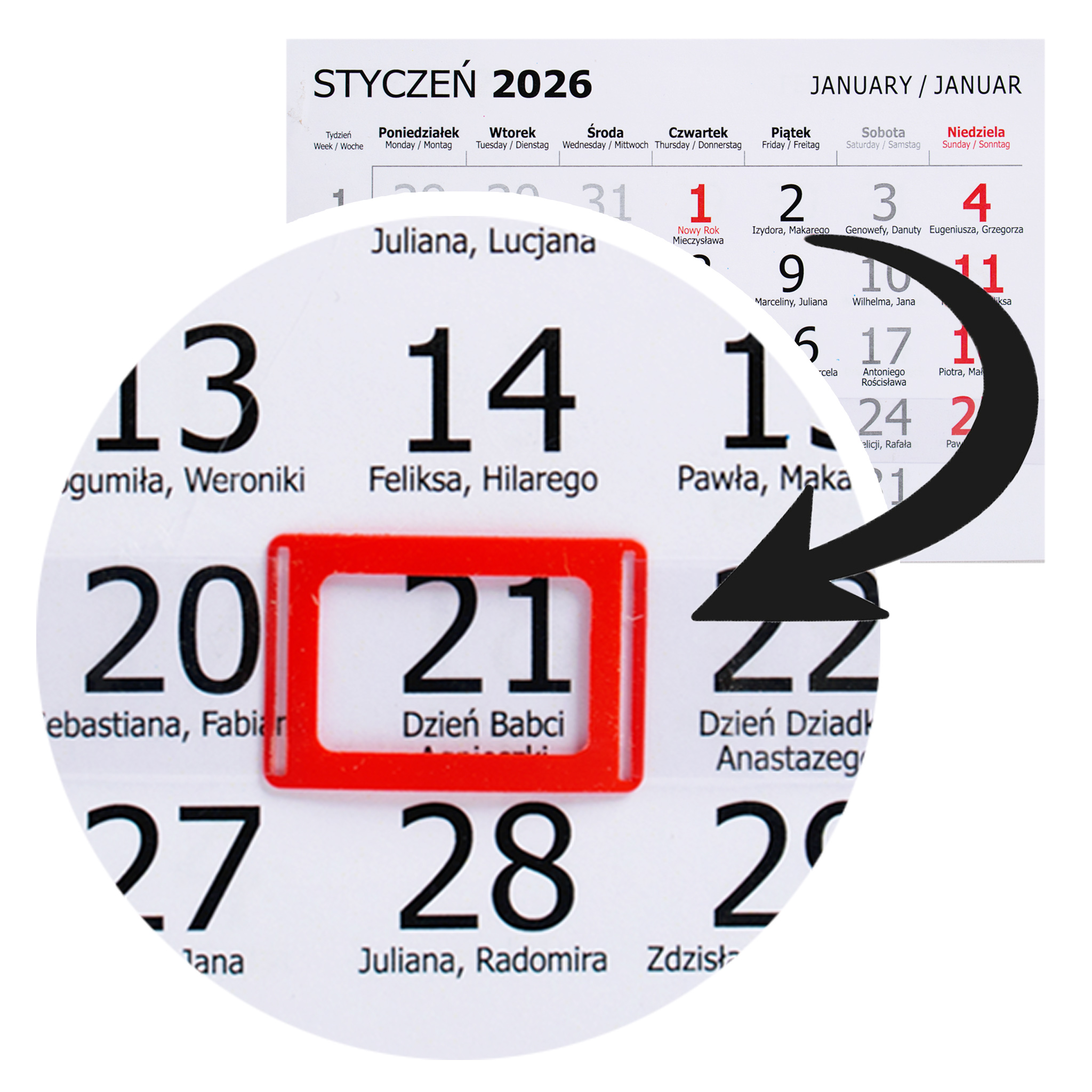 Просто купите обычный календарь формата А5, который будет доступен в любом канцелярском магазине в конце года, и прикрепите его к календарю!