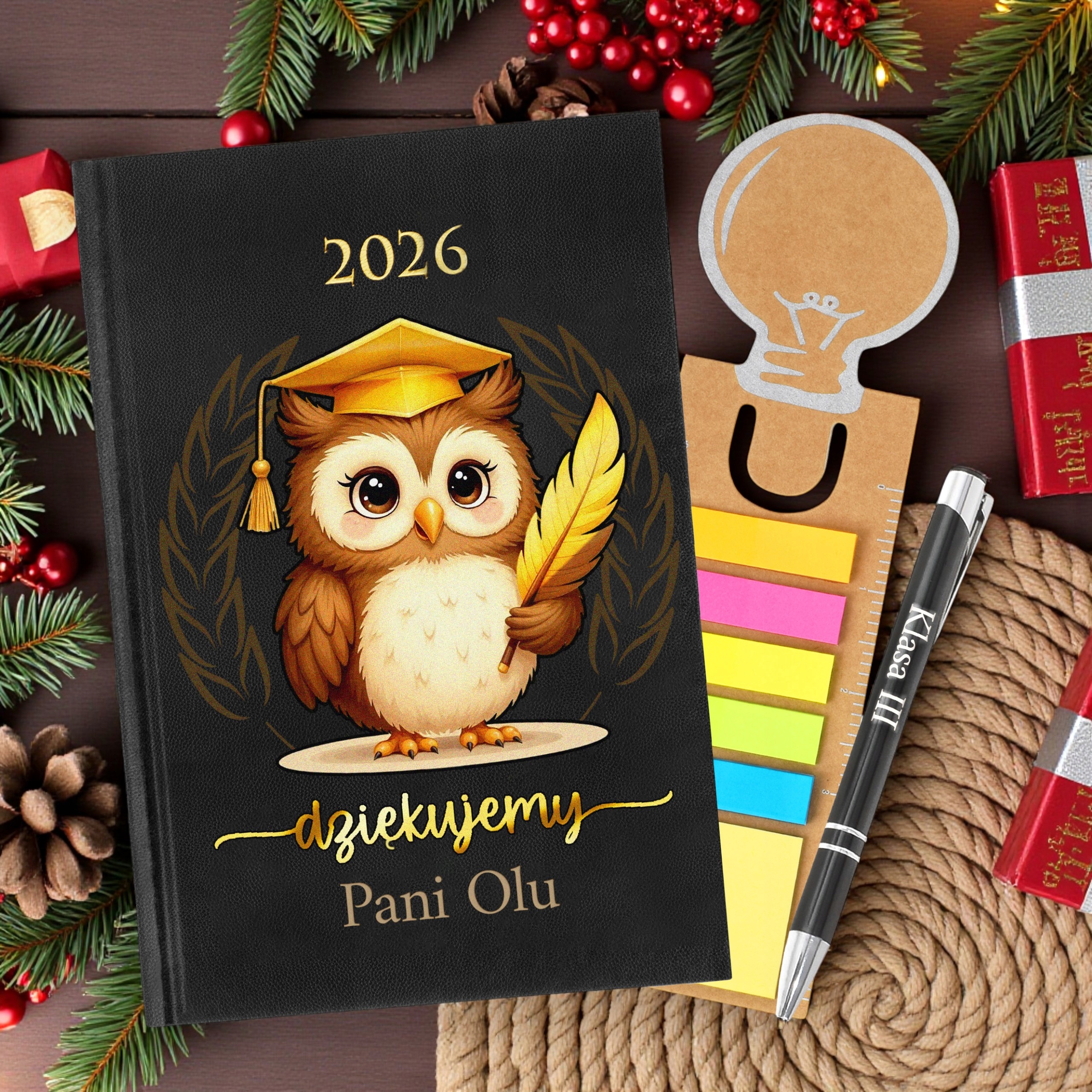 Календарь на 2026 год формата А5 — элегантный и практичный подарок учителю. Стильная черная обложка из экологического материала и высококачественная бумага позволяют календарю восхищать элегантностью и вниманием к каждой детали. Четкая планировка и место для заметок облегчают ежедневное планирование, а набор дополняется самоклеящимися заметками и персонализированной ручкой. Это функциональный подарок, сочетающий в себе эстетику и полезность и ежедневно напоминающий учащимся об уникальном жесте благодарности. ❤️