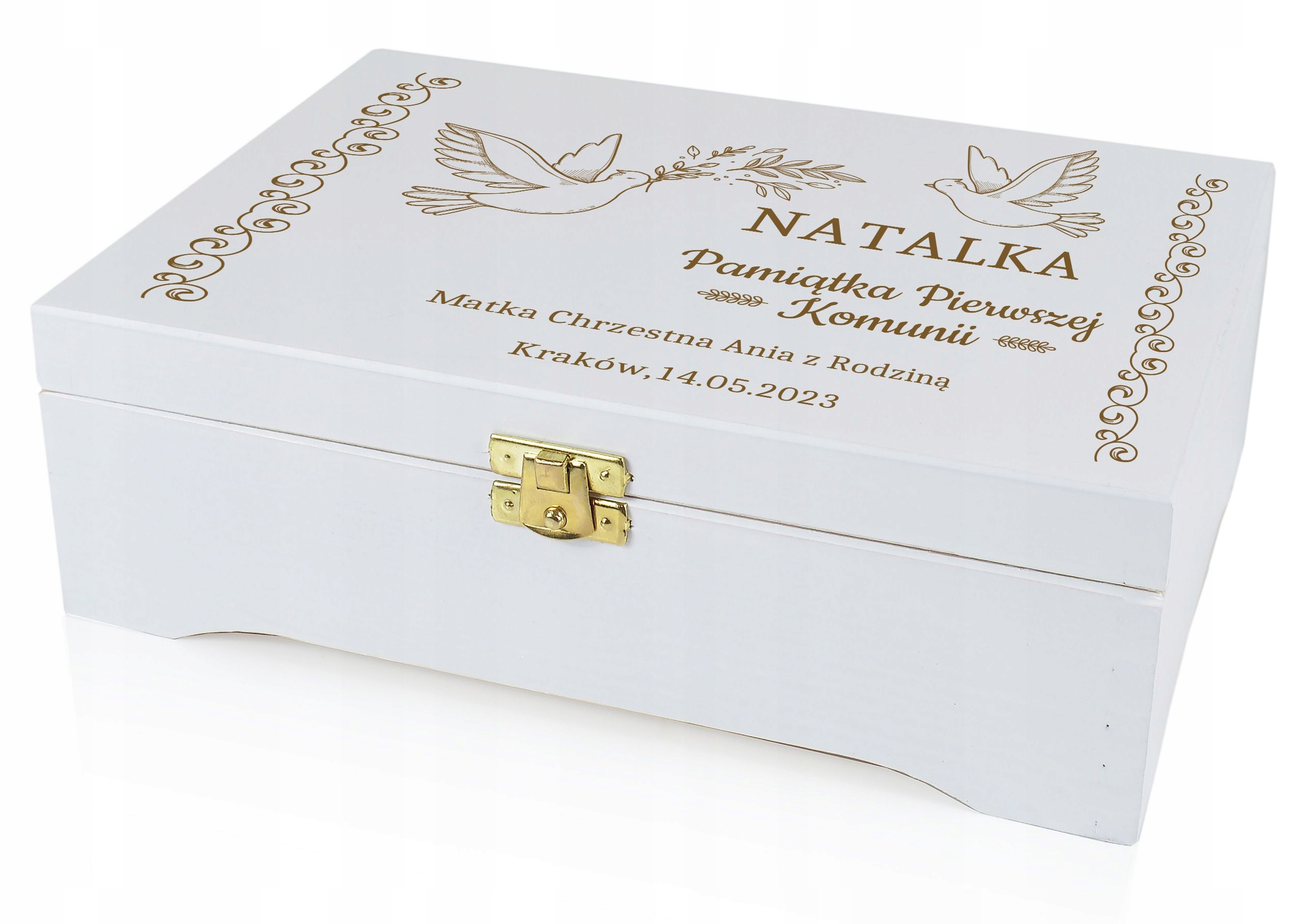 На следующем аукционе мы представляем деревянную подарочную коробку для Первого Святого Причастия. Экологичные материалы и красивая гравировка добавляют атмосферы и характера. Внутри мы можем свободно положить купюры и другие мелкие подарки. Этот оригинальный подарок вызовет улыбку на лице каждого получателя. Наше предложение адресовано людям, которые хотят удивить своих близких интересным подарком.
