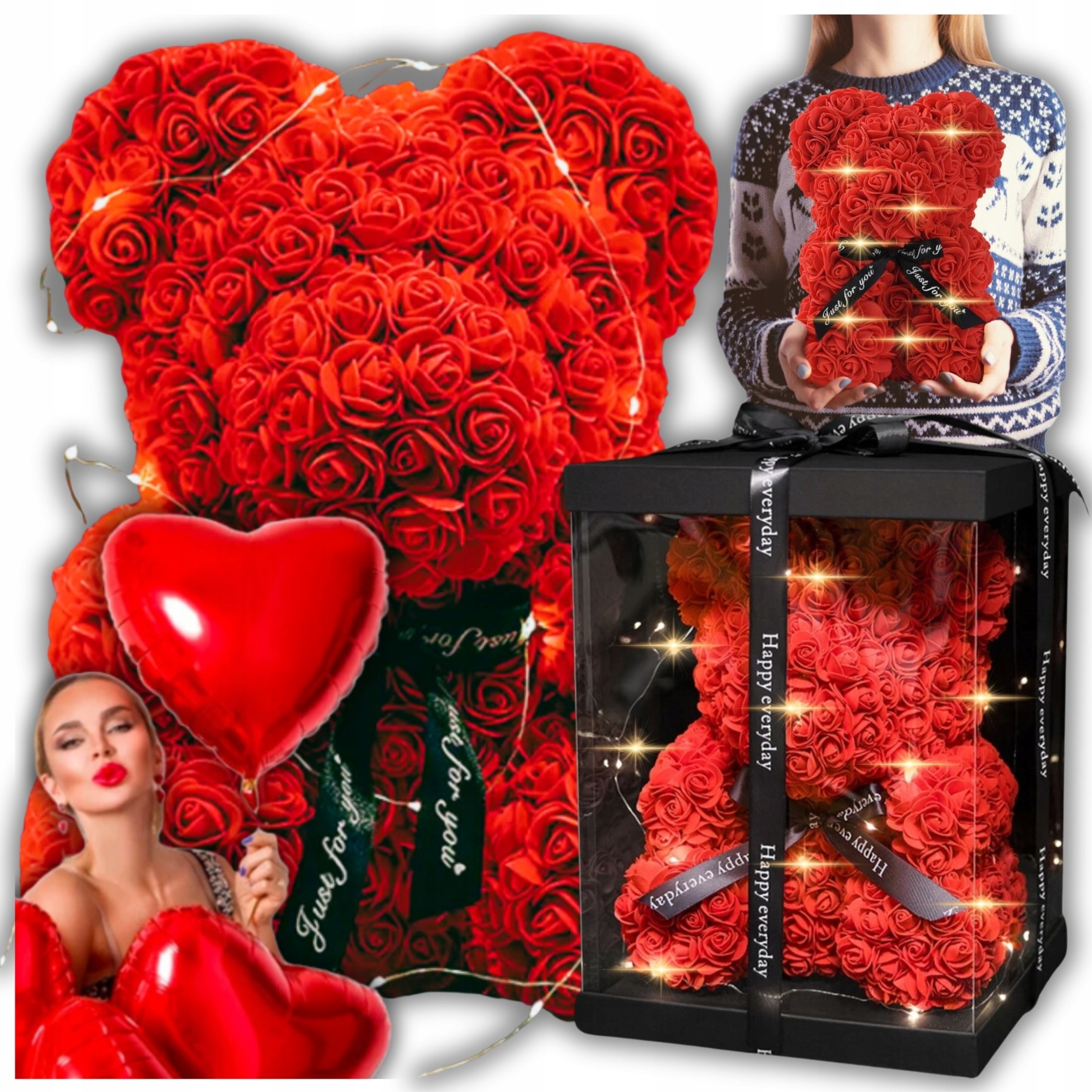 ПОДАРУНОК ДРУЖИНІ НА ДЕНЬ НАРОДЖЕННЯ, ДЕКОРАТИВНИЙ ВЕДМЕДЬ З ТРОЯНДАМИ, 40 СМ, LED СВІТЛО, ПОВІТРЯНА КУЛЯ