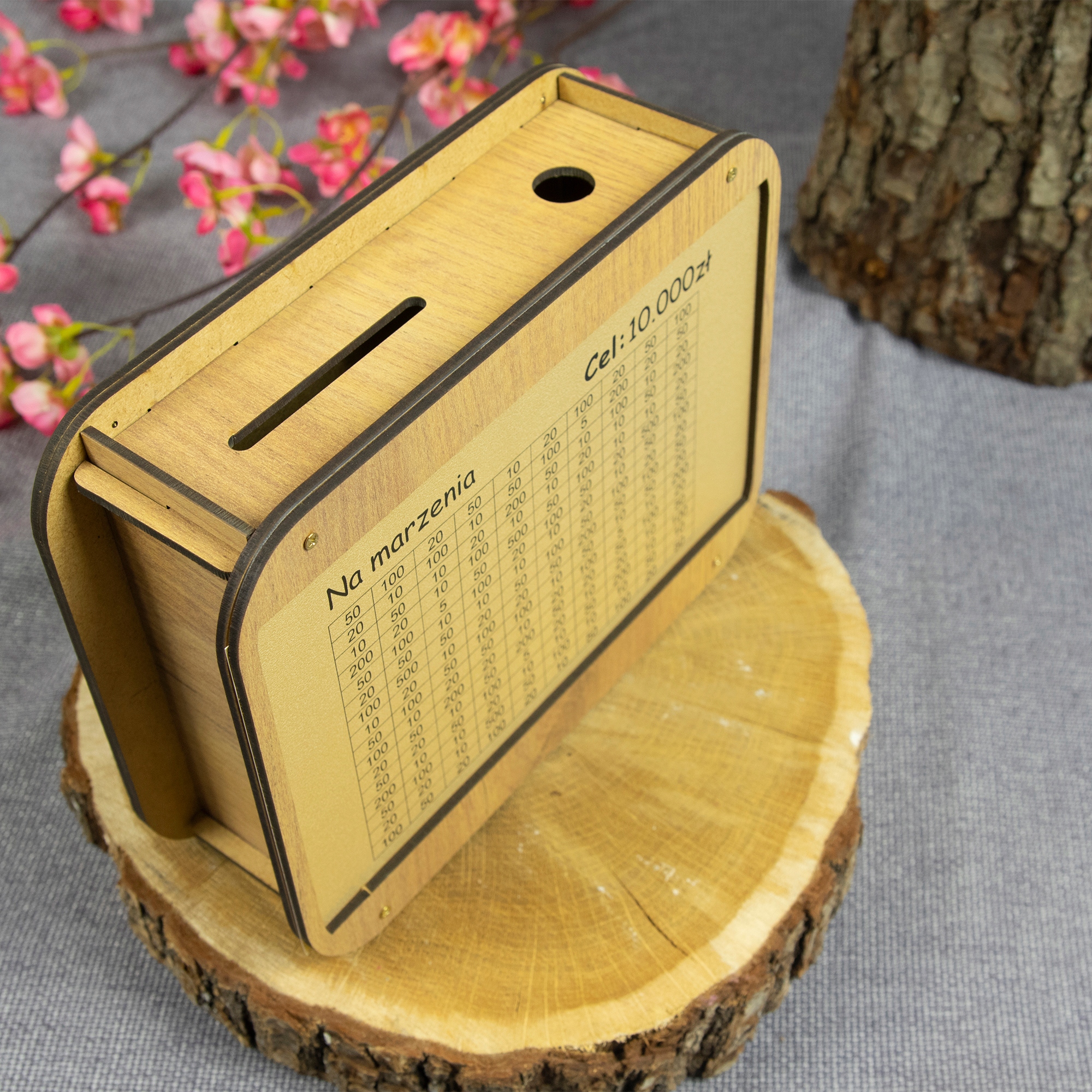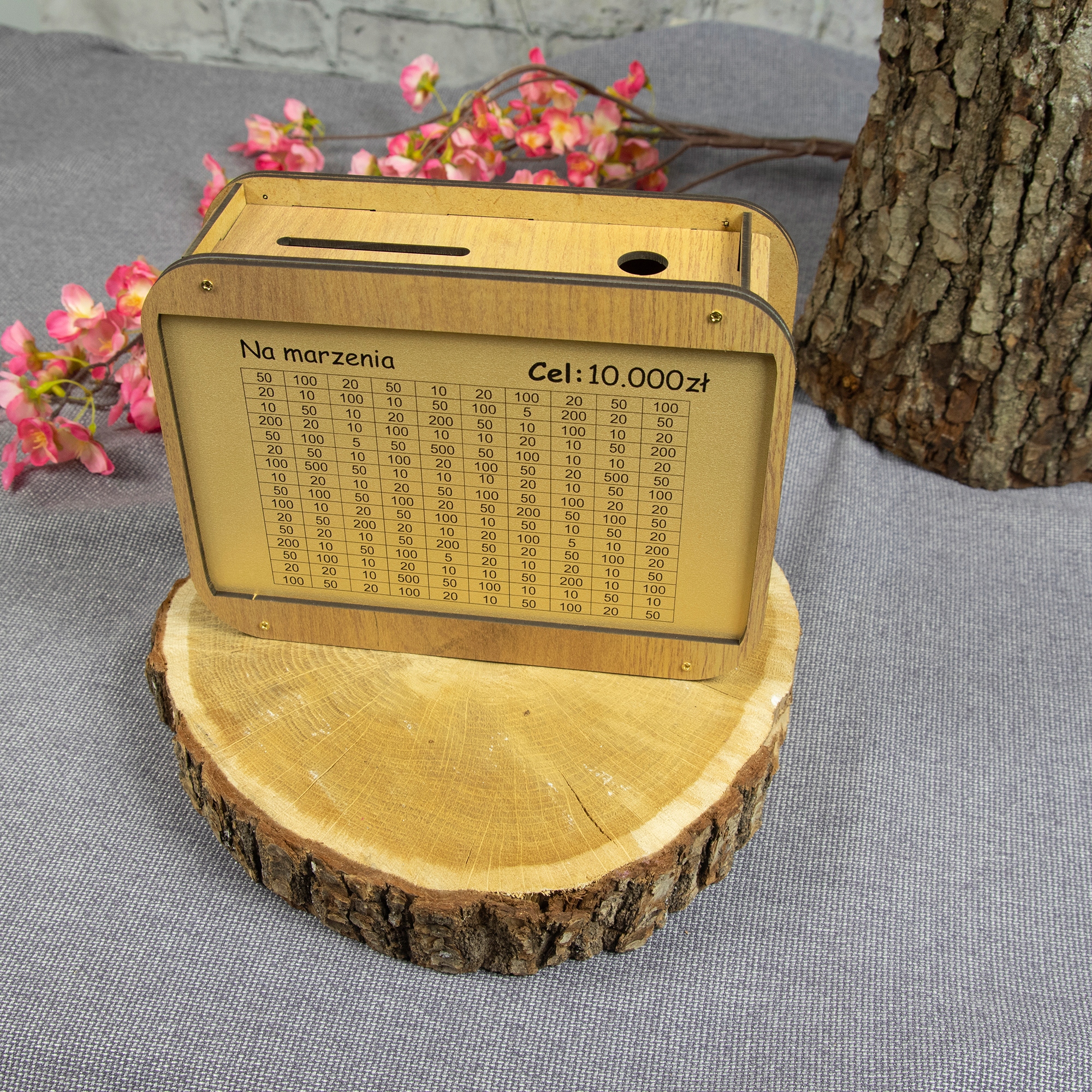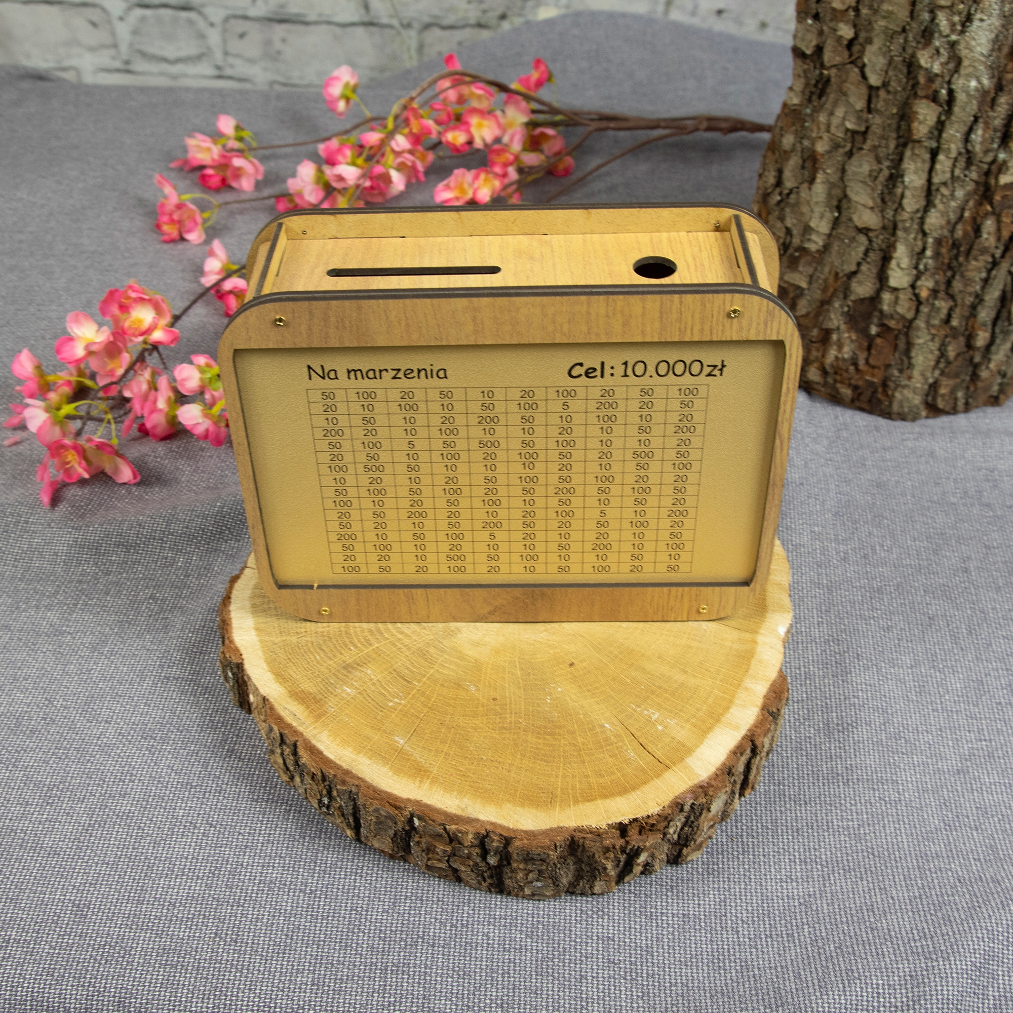 - В комплект входит 1 золотая карточка цели копилки с таблицей, на которой можно зачеркивать последующие суммы по мере добавления денежных средств.
