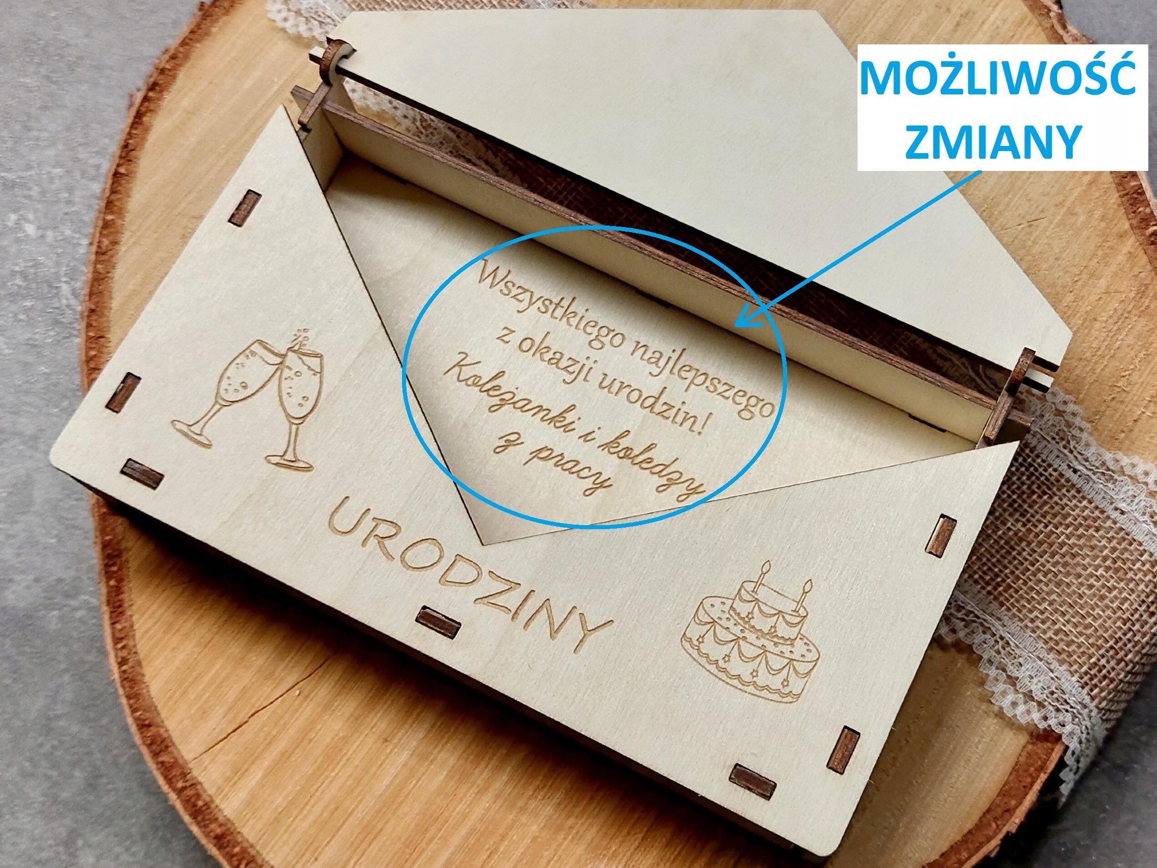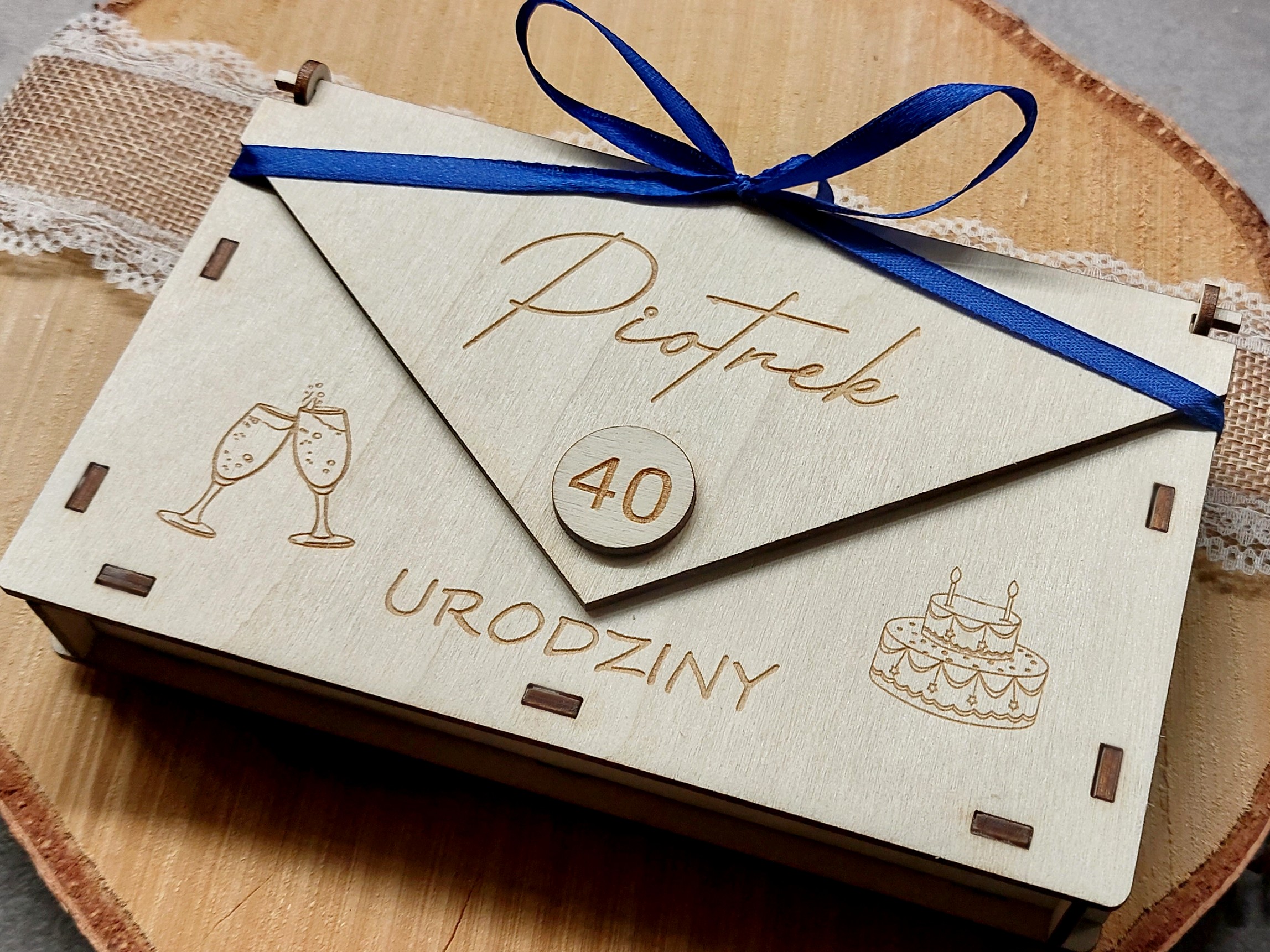 Элегантный деревянный конверт изготовлен из высококачественной натуральной древесины (3 -миллиметровая фанера). Он вырезан лазером, а затем с ручным отшлифованием. Он содержит декоративную графику с изображением торта и очков. Банкноты и другие небольшие подарки будут вписаться в конверт. Как бесплатно, мы добавляем в коробку 5 ПК. Круглые диски/кольца для банкнот!
