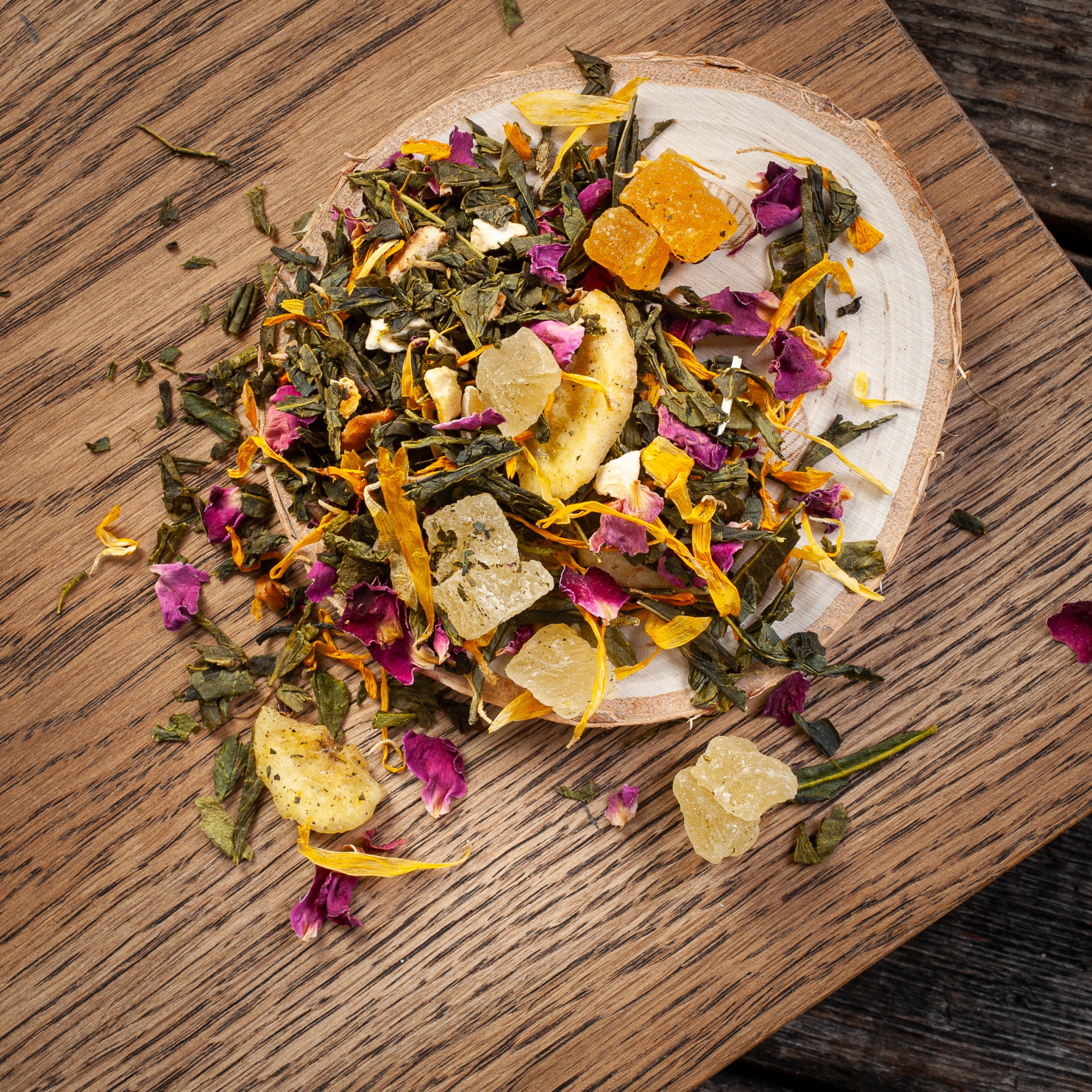 Чай зеленый Paradise Garden: Зеленый чай Сенча, банан, цукаты из дыни, папайя, яблоко, цедра лимона, календула, лепестки розы, аромат.