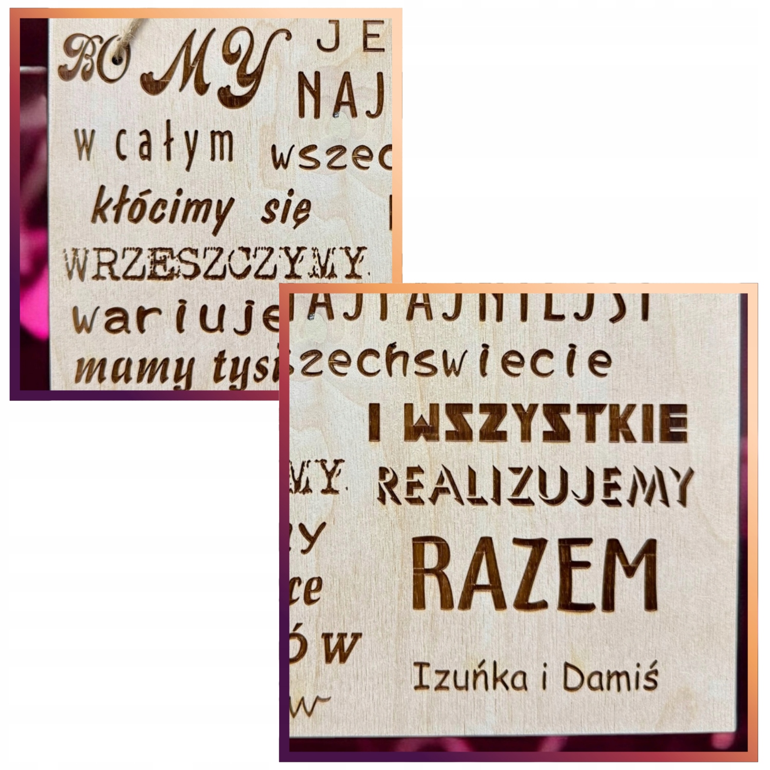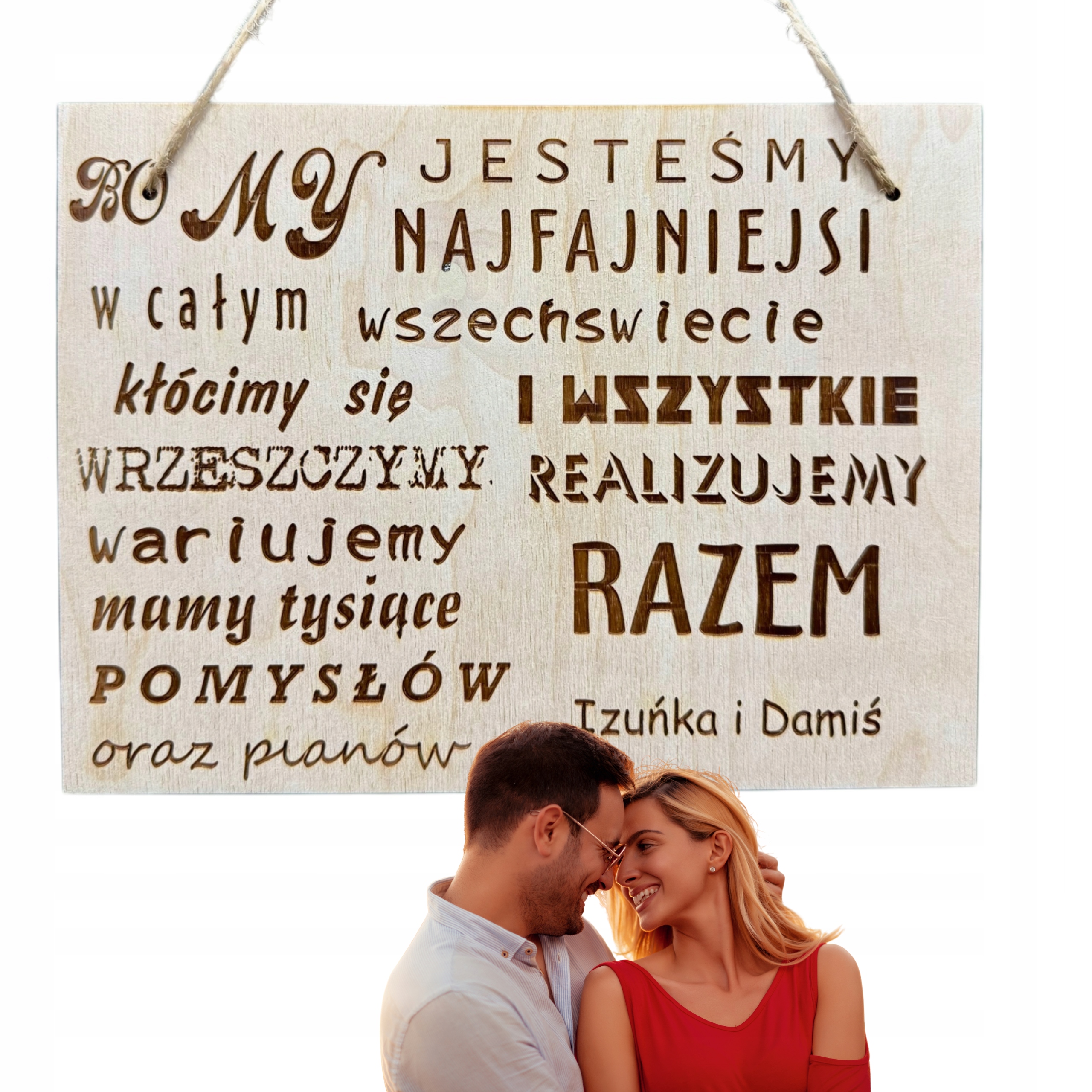 Уникальное послание, полное эмоций и юмора • Текст на доске прекрасно отражает дух настоящих отношений – радость, смех, иногда мелкие недоразумения, но, прежде всего, совместная реализация мечтаний и идей. Это красивый сувенир, который напомнит получателям об их уникальной связи.Точное исполнение и долговечность• Табличка изготовлена из высококачественной деревянной фанеры, надпись вырезана методом лазерной гравировки. Благодаря этому детали прекрасно воспроизводятся, а надписи останутся читаемыми долгие годы. Лазерная гравировка гарантирует долговечность, которая выдержит испытание временем.Естественный, эстетичный внешний вид • Дерево придает табличке теплый и уютный характер, который идеально вписывается в любой интерьер – как современный, так и деревенский. Благодаря минималистичному дизайну табличка тонко украшает пространство и привлекает внимание.Персонализация и универсальность • Возможность добавить свои собственные имена или посвящения делает подарок еще более личным и уникальным. Идеально подходит как для пар, так и для друзей, которые разделяют общие увлечения и цели.Готов к подвешиванию • Знак оснащен прочной веревкой, поэтому его можно сразу же повесить. Независимо от того, повесите ли вы ее в гостиной, спальне или на входную дверь – она будет выглядеть красиво и представлять собой интересный декоративный элемент.Многофункциональность – не только украшение • Такая табличка – это не только украшение, но и ежедневное напоминание о близком человеке. Каждый взгляд на нее заставит вас улыбнуться и навеет приятные воспоминания. Идеально подходит для того, чтобы повесить дома, в офисе или в любом другом месте, где требуется немного уюта и позитивной энергии.