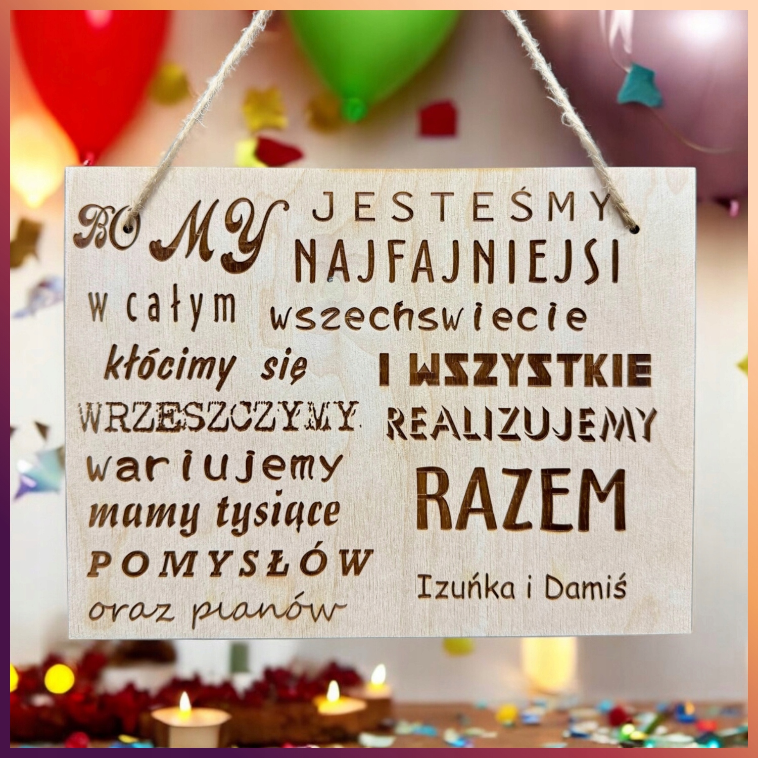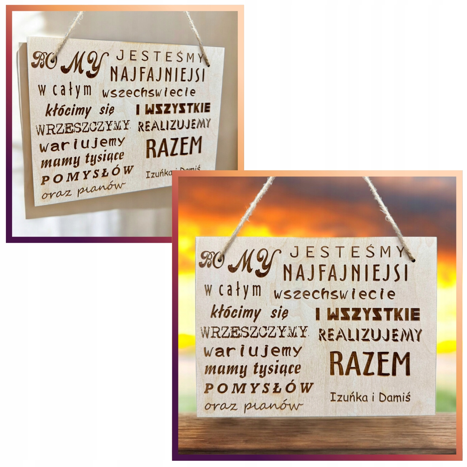 Уникальное послание, полное эмоций и юмора • Текст на доске прекрасно отражает дух настоящих отношений – радость, смех, иногда мелкие недоразумения, но, прежде всего, совместная реализация мечтаний и идей. Это красивый сувенир, который напомнит получателям об их уникальной связи.Точное исполнение и долговечность• Табличка изготовлена из высококачественной деревянной фанеры, надпись вырезана методом лазерной гравировки. Благодаря этому детали прекрасно воспроизводятся, а надписи останутся читаемыми долгие годы. Лазерная гравировка гарантирует долговечность, которая выдержит испытание временем.Естественный, эстетичный внешний вид • Дерево придает табличке теплый и уютный характер, который идеально вписывается в любой интерьер – как современный, так и деревенский. Благодаря минималистичному дизайну табличка тонко украшает пространство и привлекает внимание.Персонализация и универсальность • Возможность добавить свои собственные имена или посвящения делает подарок еще более личным и уникальным. Идеально подходит как для пар, так и для друзей, которые разделяют общие увлечения и цели.Готов к подвешиванию • Знак оснащен прочной веревкой, поэтому его можно сразу же повесить. Независимо от того, повесите ли вы ее в гостиной, спальне или на входную дверь – она будет выглядеть красиво и представлять собой интересный декоративный элемент.Многофункциональность – не только украшение • Такая табличка – это не только украшение, но и ежедневное напоминание о близком человеке. Каждый взгляд на нее заставит вас улыбнуться и навеет приятные воспоминания. Идеально подходит для подвешивания дома, в офисе или в любом другом месте, где требуется немного уюта и позитивной энергии.
