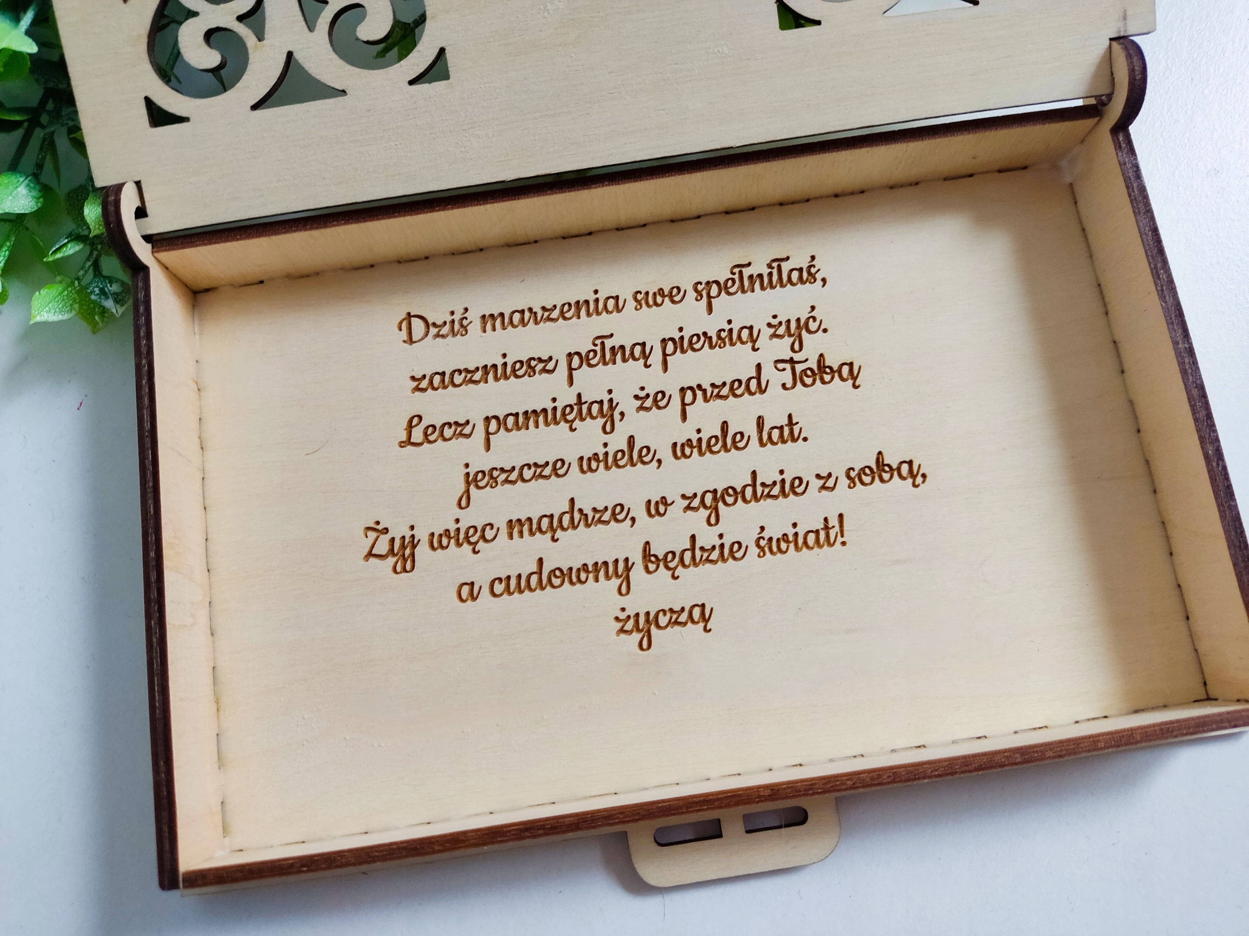 Красивая ажурная коробочка внутри с гравировкой пожеланий.