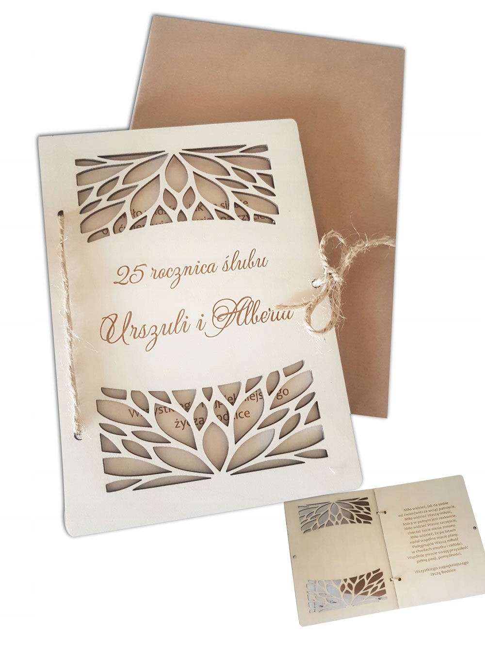 Размером А5, деревянная, с гравировкой, входит в комплект с конвертом.