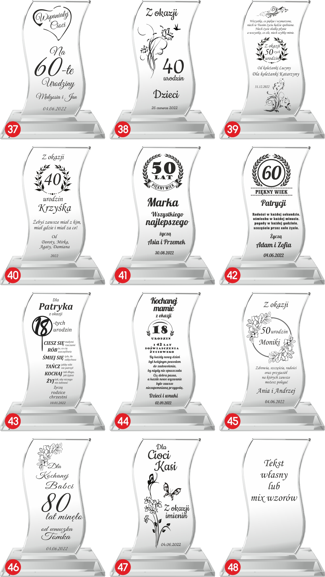 Если вы не соответствуете шаблону присланной нами информации, мы не несем ответственности за любые ошибки в гравировке. Тексты и варианты могут свободно изменяться по вашему усмотрению (тексты, отличные от представленных в наших вариантах, необходимо расшифровать на компьютере и отправить нам, например, в тетради). Номера годовщины приведены в качестве примера и могут быть изменены. Тексты, отправленные в виде скриншотов или фотографий, расшифровываться не будут. Расшифрованный текст необходимо предоставить. Продавец информирует, что изделия из стекла могут содержать на поверхности небольшие пузырьки воздуха и царапины, возникшие в результате производственного процесса.< /п>