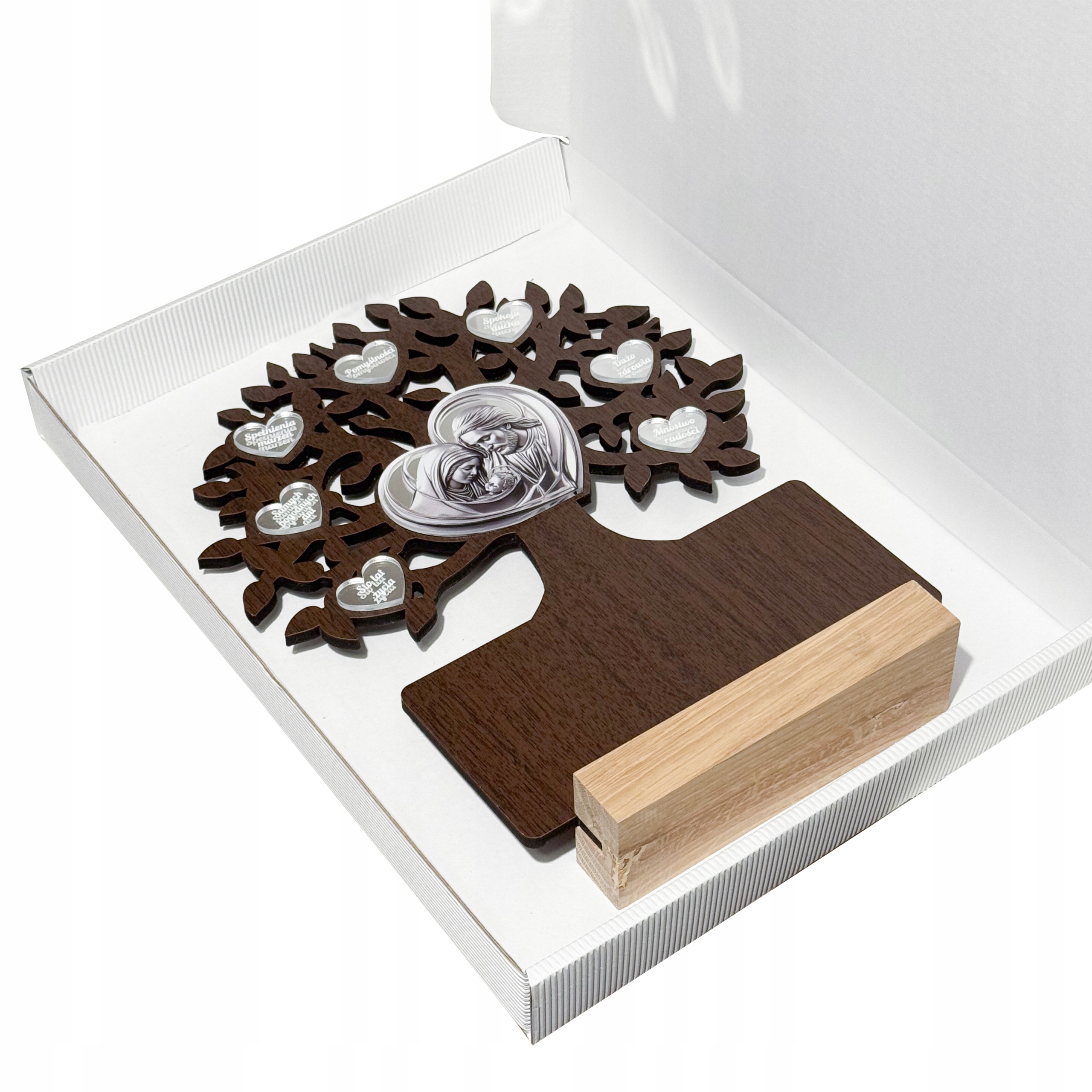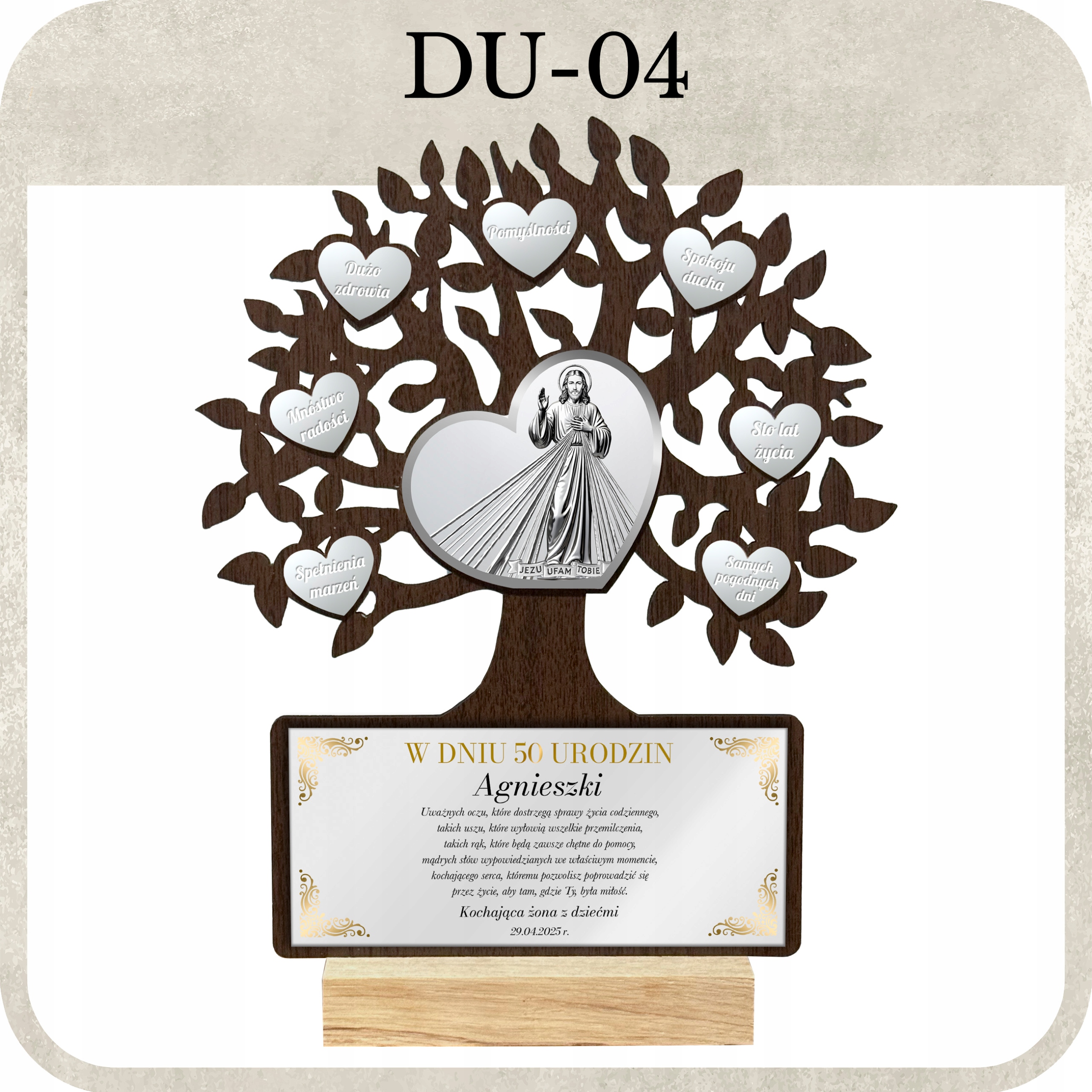 Нарядное Дерево Счастья с изображением Иисуса Милосердного – уникальный подарок юбилею со дня рождения. Изготовленный из массива МДФ, с красивыми деталями и зеркальной поверхностью, он станет прекрасным сувениром для родителей, бабушек и дедушек или близких людей. Благодаря персонализированным элементам, например серебряной табличке с посвящением, подарок становится уникальным и адаптированным к случаю.