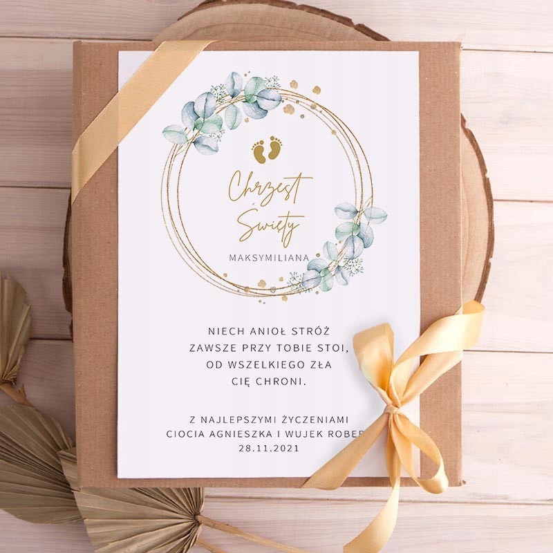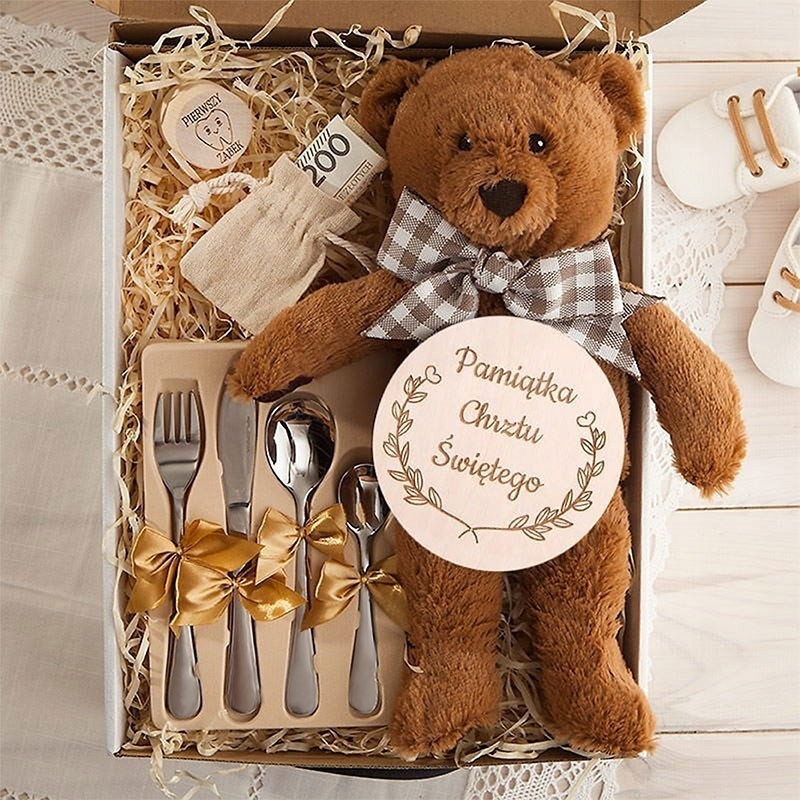 Подарок на крещение мальчику и девочке в виде большой коробки со столовыми приборами, мишкой и аксессуарами, который станет отличным сувениром для малыша. Фантастический способ очаровать вашего ребенка и сделать его счастливым! Крышка коробки украшена специальной самоклеящейся наклейкой с текстом, графическим мотивом и персонализацией.