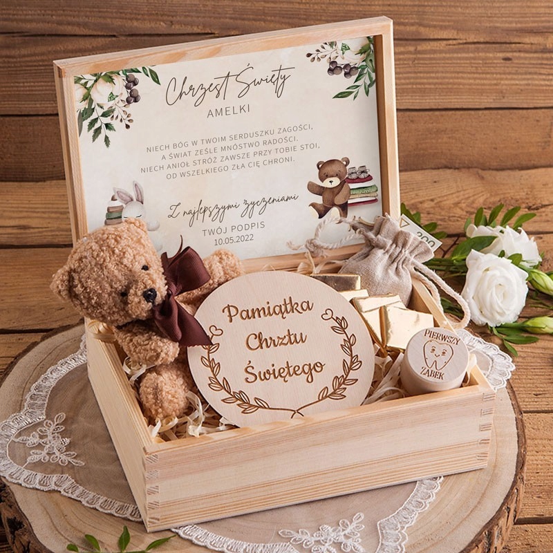 Подарок на крещение ребенка в деревянной коробке с очаровательным талисманом плюшевого мишки. В комплект также входит кольцо с выгравированной надписью «Сувенир Святого Крещения», коробочка для зубных щеток, молочные шоколадки и мешочек для дарения денег. Все это выглядит красиво и уникально. Коробку увенчивает карточка с графикой и персонализацией.