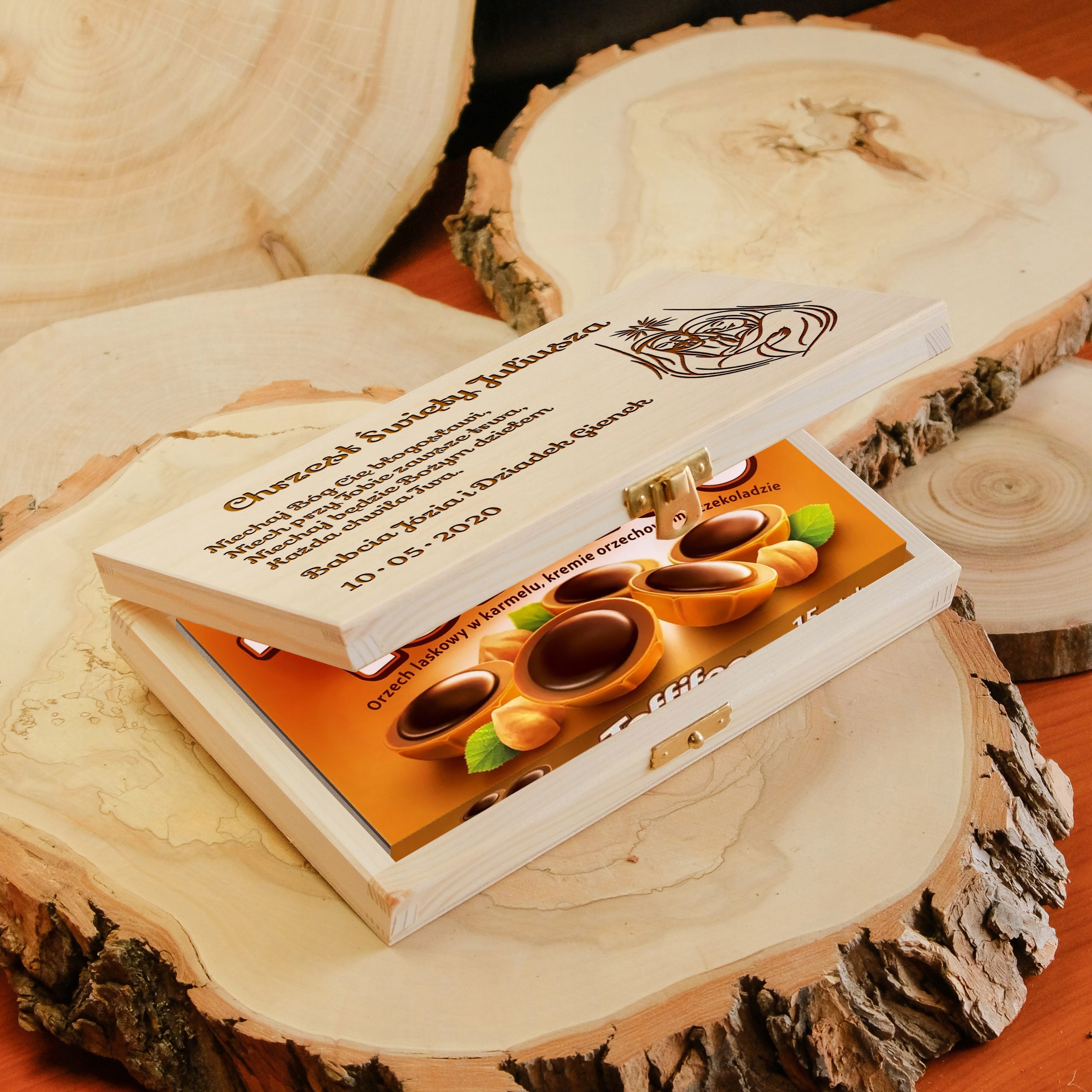 Коробка с персонализированной гравировкой на крышке — идеальная упаковка для небольшого подарка, например шоколада.