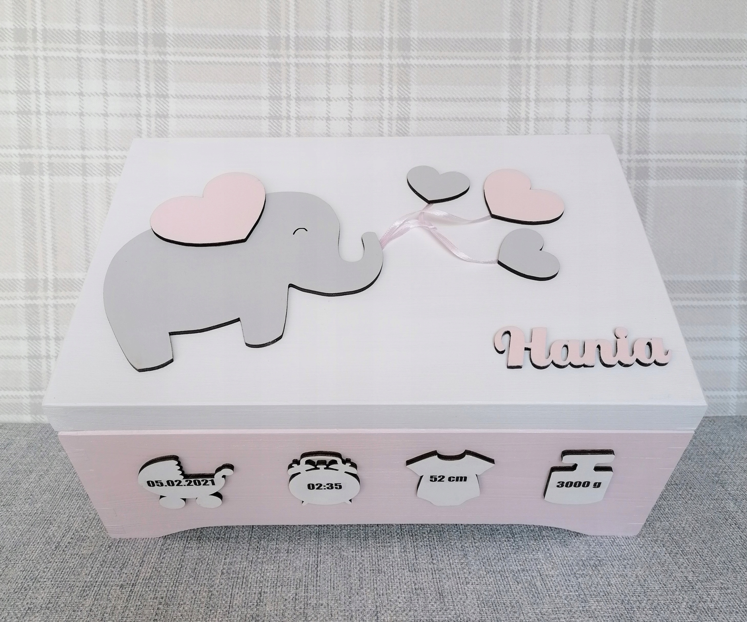На крышке коробки, окрашенной в белый цвет, изображен серый слоник, сердечки и имя ребенка.