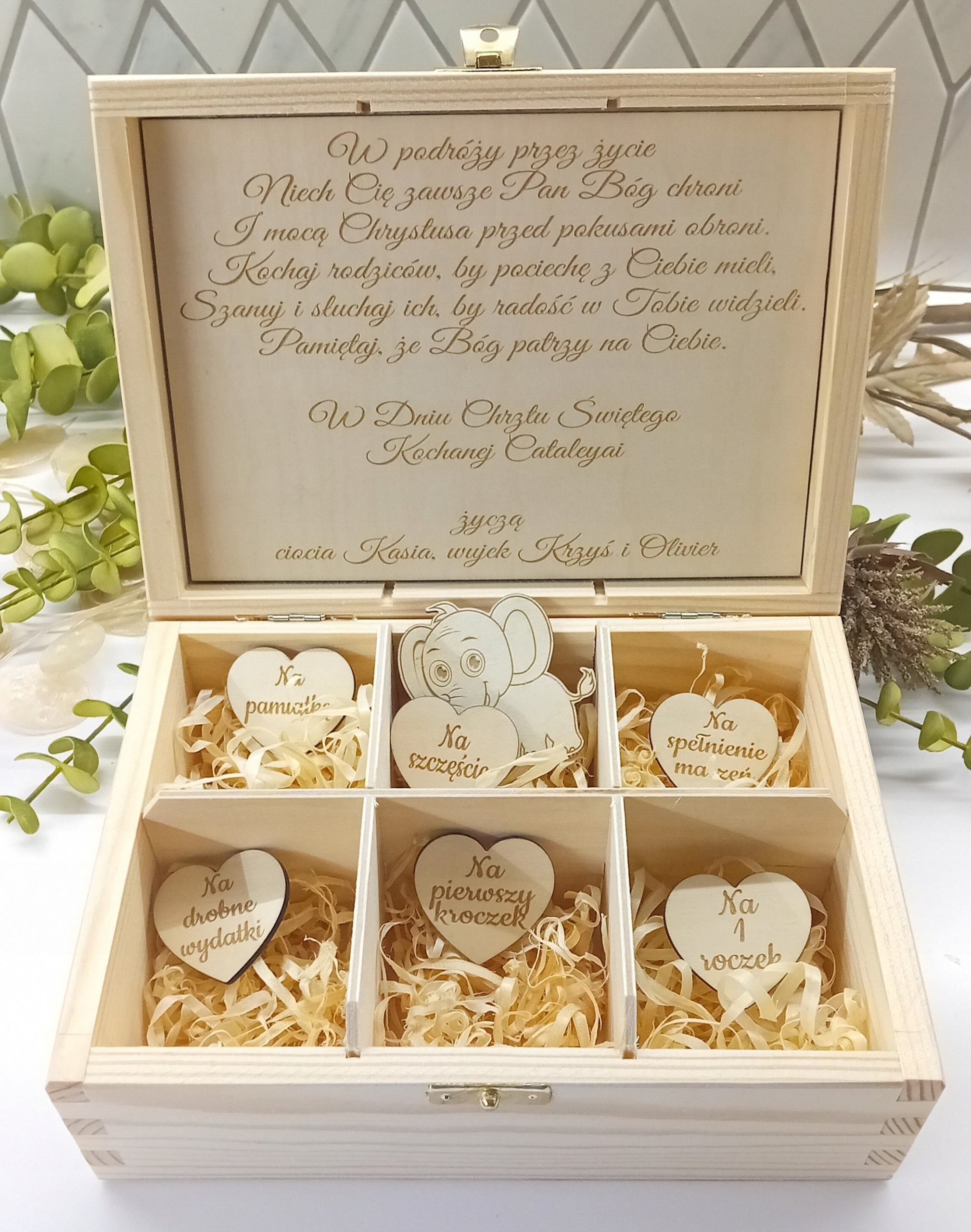 Деревянная шкатулка с отделениями - это уникальный подарок на крещение, годовалик или день рождения. Персонализация позволяет сделать оригинальный подарок к разным поводам. Подарок станет сувениром на долгие годы.