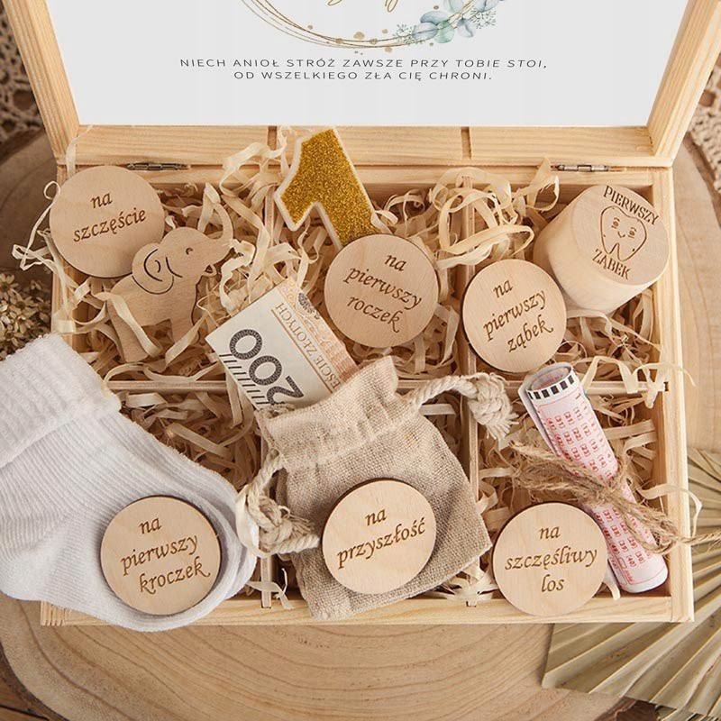 - Состав: подарок девочке и мальчику на годик, помещенный в деревянная шкатулка, включающая символы, означающие первые моменты жизни ребенка: носки для первого шага, праздничную свечу на первый год (отправляется случайным образом в золоте или серебре), коробочку для первого зуба, мешок для денег, лотерейный билет на счастливый билет, слон на удачу; к каждому предмету прикреплена бирка из натурального дерева с гравировкой его назначения; коробка наполнена декоративной древесной шерстью, внутри находится открытка с соответствующей графикой, пожеланиями и индивидуальной подписью