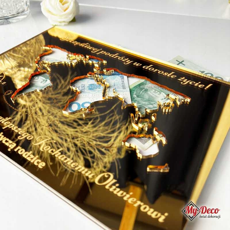 Наша элегантная денежная рамка с картой мира является роскошным дополнением к жизни, которая источает стиль и элегантность. Сделанный из блестящего золотого плексигласа, 27x19 см, это как практическое место для щедрых финансовых подарков, так и уникальное украшение для юбилея и его семьи. p>