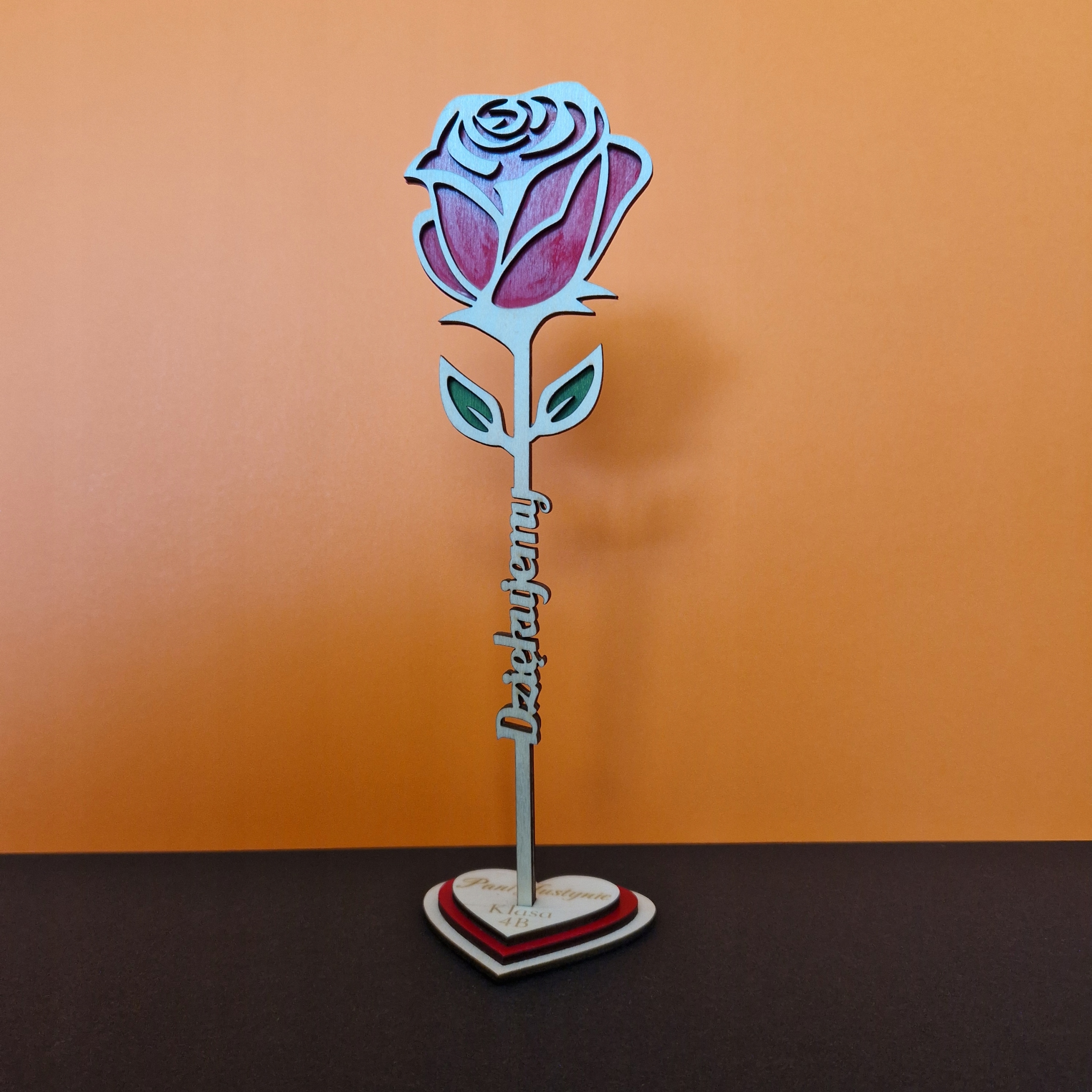 На стебле есть надпись «Спасибо». «Верхний слой основания выгравировался в соответствии с индивидуальным порядком. только внизу: "Марисия и Янек"; только топ: «Бри -Лов -бабушка». Текст для гравюры, мы отправим гладкую основу (пустое, без какого -либо гравированного текста).