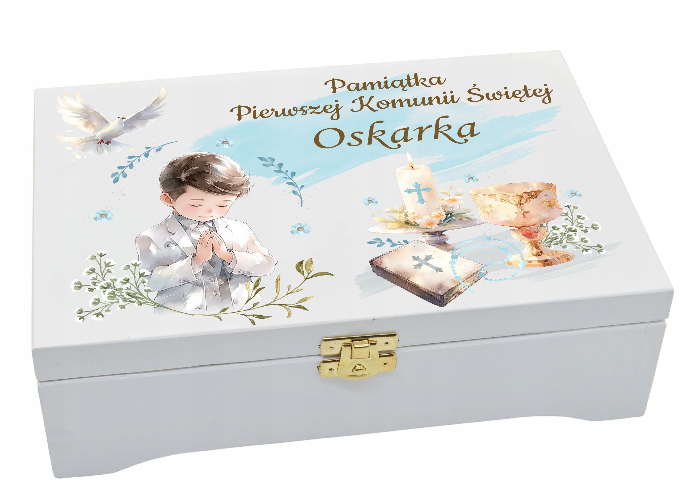На следующем аукционе мы представляем деревянную подарочную коробку для Первого Святого Причастия. Экологически чистые материалы и красивый принт добавляют атмосферы и характера. Мы можем свободно положить внутрь купюры и другие небольшие подарки.