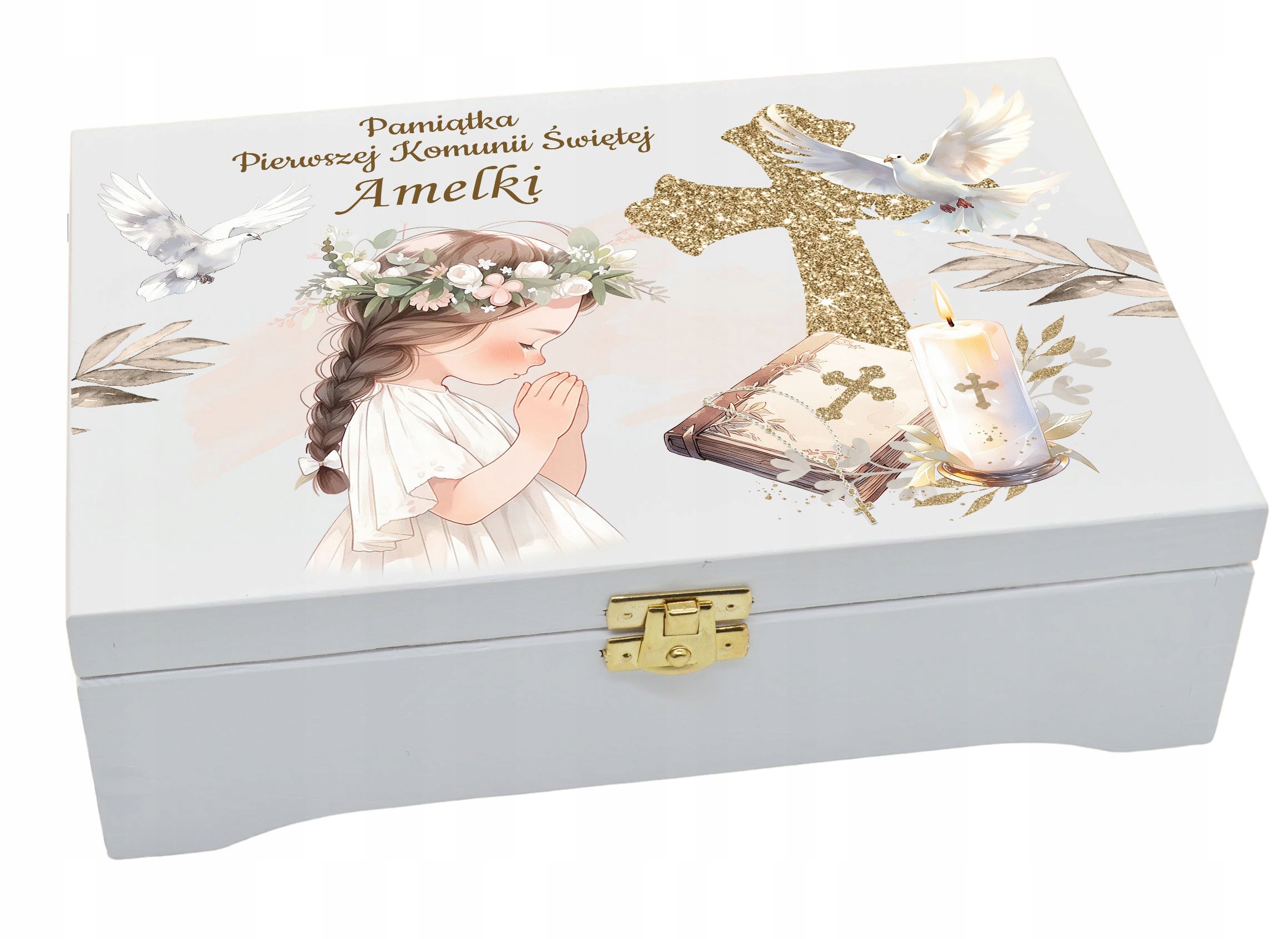 На следующем аукционе мы представляем деревянную подарочную коробку для Первого Святого Причастия. Экологичные материалы и красивый принт добавляют атмосферы и характера. Мы можем свободно положить внутрь купюры и другие небольшие подарки.