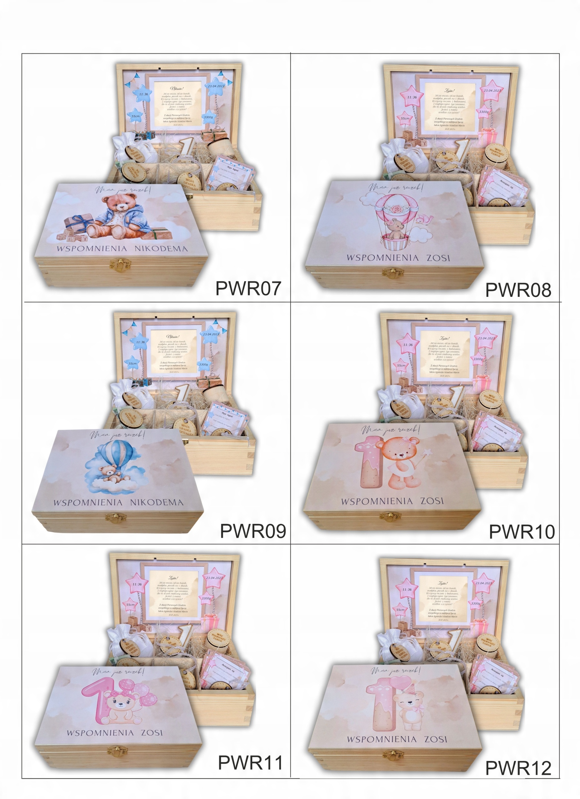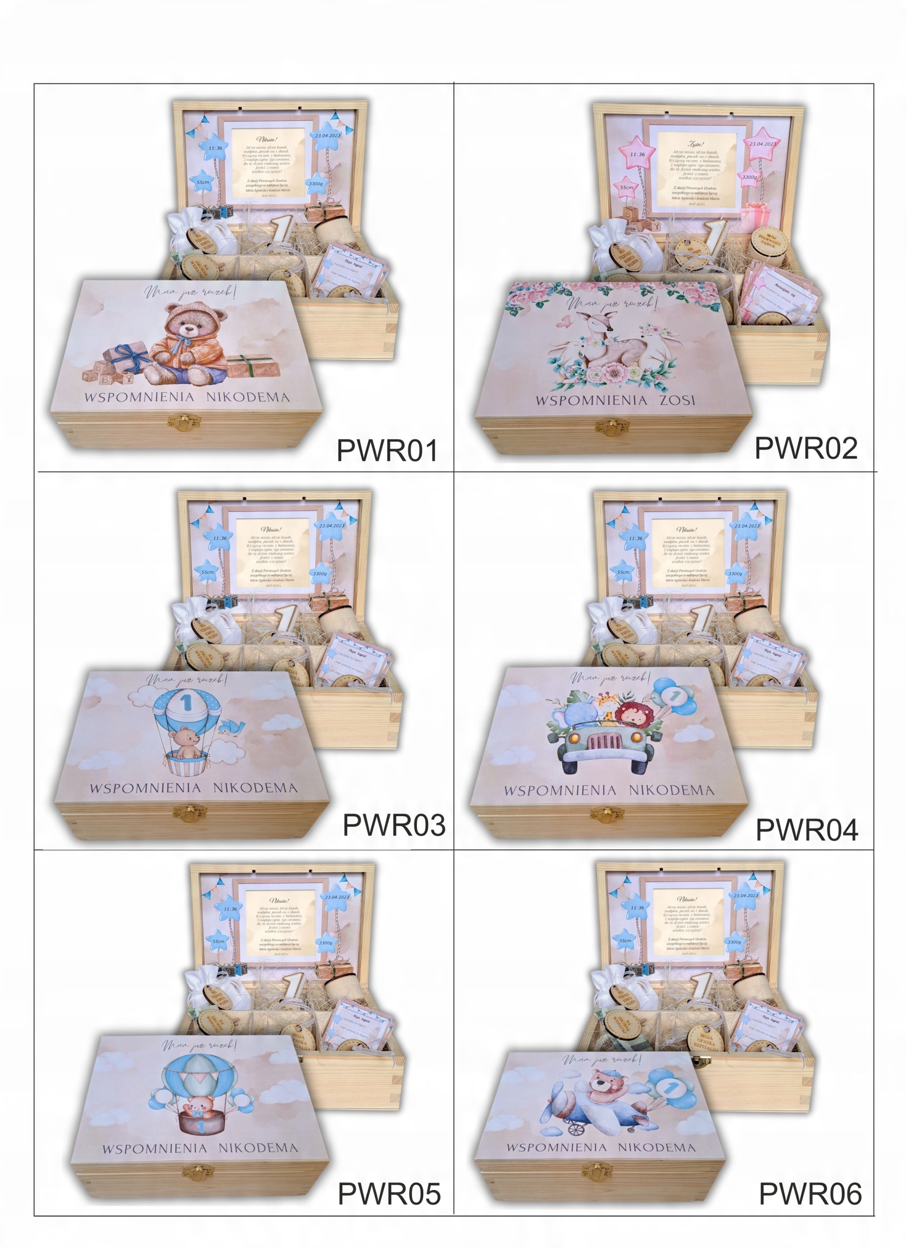 <р>1. свеча с цифрой 1 (для торта на первый день рождения) <р>2. деревянная открывающаяся коробочка (для первых молочных зубов) <р>3. джутовый мешочек (для первой пряди волос) <р>4. набор из 12 карточек, которые должны заполнить родители, описывая первые моменты жизни и развитие ребенкаПРИМЕЧАНИЕ: в коробке нет денег — это реквизит, использованный для фотосессии.