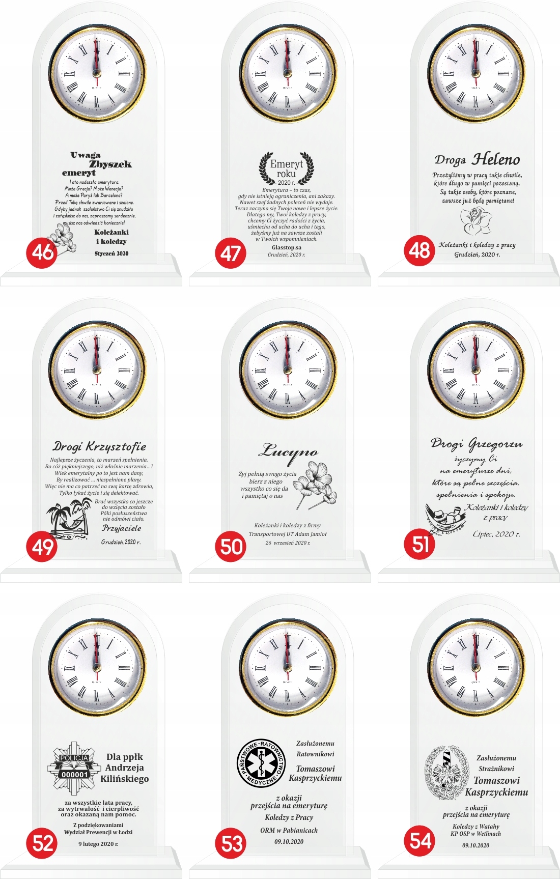 Красивые стеклянные часы - спасибо с технологией лазерной гравировки прямо на объекте. Статуэтка стекла отлично смотрится благодаря классической форме. Статуэтка встроена на твердую основу того же материала, который постоянно подключен. Гравюра производится на высококачественном лазерном платтере. Это означает, что гравюра даже на нескольких приобретенных продуктах ничем не отличается. Кроме того, он вручную и очень тщательно заполнен мастером с особой краской. Золотая краска дает удивительный эффект . Вы не найдете такого высокого качества нигде. Человек, который получает подарок, сделанный в таком высоком качестве, определенно будет в восторге, и вы будете гордиться тем, что можете его дать.