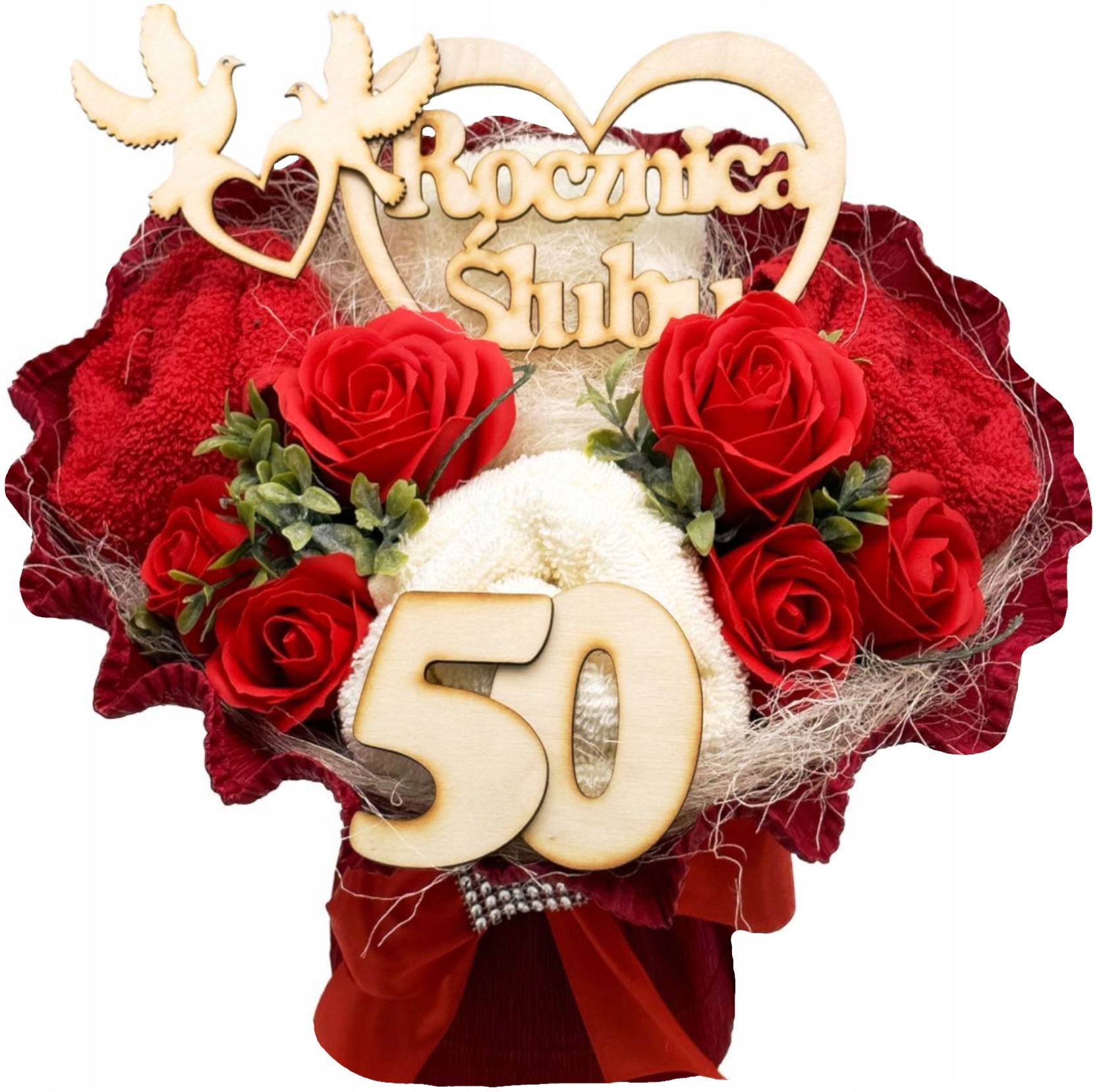 Не ищите дальше! Наш букет из полотенец представляет собой идеальное сочетание элегантности и функциональности. Вместо цветов, которые завянут, подарите букет из двух качественных полотенец, красиво украшенных мыльными цветами и деревянным сердцем.